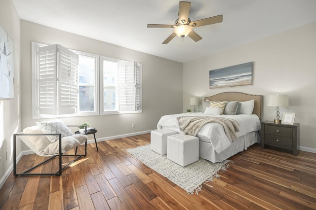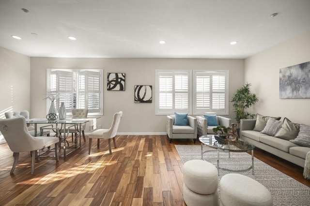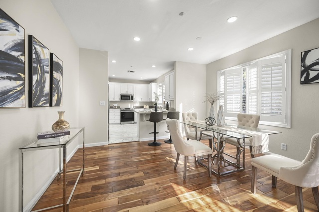 Stunning Corner 2BR/2BA, approximately 1,538 SQ.FT. Townhome on the quiet side of the complex, where light meets comfort in this pristine unit that blends contemporary elegance with everyday practicality. The open floor plan fills with natural light from expansive windows, with luxury hardwood floors flowing through the living, dining, bedrooms, and stairs. Custom plantation shutters, LED recessed lighting, and modern hardware elevate the ambiance. The gourmet kitchen offers stainless steel appliances, luxury vinyl flooring, a generous breakfast bar, Corian countertops, ample cabinetry, and modern knobs for entertaining. The spacious master retreat features a large closet. A balcony off the kitchen and first bedroom provides partial park views, perfect for morning coffee. A nearby laundry room with shelving adds convenience. Located near Emerald Glen Park and Dublin Wave, with top-rated schools nearby and easy access to BART, Whole Foods, major freeways, and abundant shopping and dining options, making this a true lifestyle residence. Schedule your private tour today and experience this move-in-ready Dublin property.