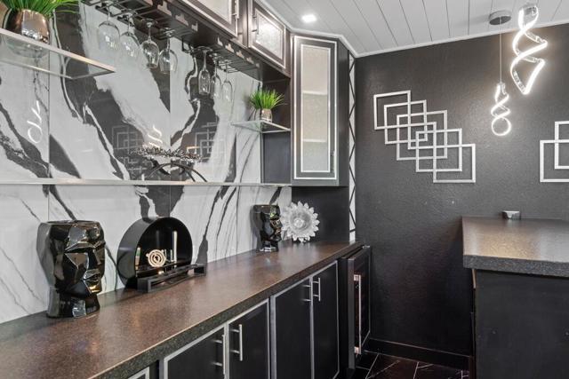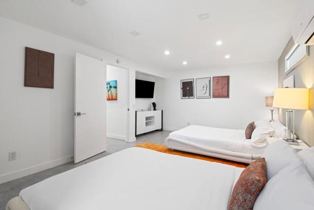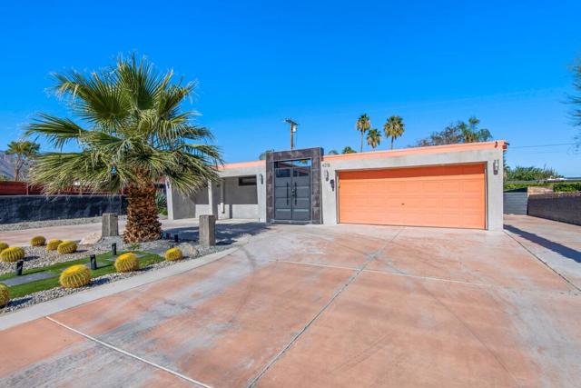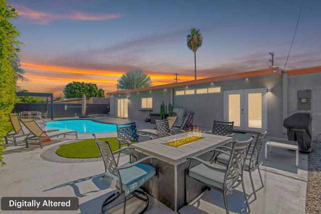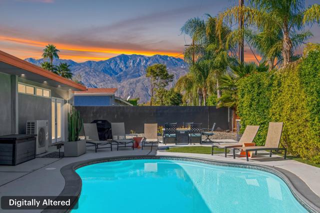 Discover your dream home in this beautifully renovated, 3-bedroom, 2-bath pool oasis. Featuring exceptional curb appeal, mountain views, an attached 2-car garage, and a spacious semi-circle driveway, this house is ready to welcome you. Step inside through double glass doors into a formal entryway with built-in shelving, leading to a modern kitchen with a central island, bar seating, custom tile backsplash, white cabinetry, and stainless steel appliances. The open floor plan seamlessly connects the kitchen to a dining area with access to the backyard and a large living room, complete with an entertainer's built-in dry bar featuring Palm Springs signage. Retreat to the luxurious primary suite at the end of the hall, offering double glass doors to the backyard and a spa-like ensuite with dual sinks, custom tile floors, 3D tile walls, and a walk-in shower. The additional two bedrooms and a full hall bathroom, all boasting custom tile finishes, provide comfort and style. The entertainer's backyard is your personal paradise, with a deep in-ground heated pool (newer pool pump with Smart auto-fill technology), a custom built-in firepit, a heavy-duty aluminum frame pergola with a private screen for relaxation, a combination of concrete and turf, and breathtaking mountain views. Conveniently located near shopping, dining, parks, golf, and all the best of Palm Springs, this masterpiece is waiting for you to tour and make it your own. Don't miss the chance to claim this stunning home!