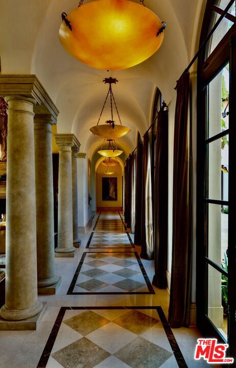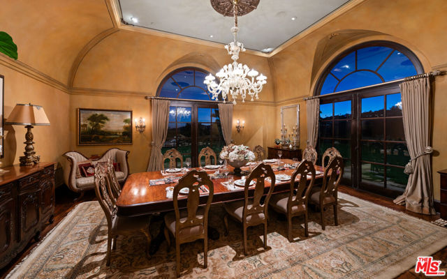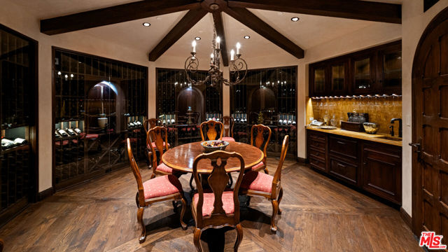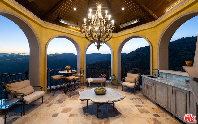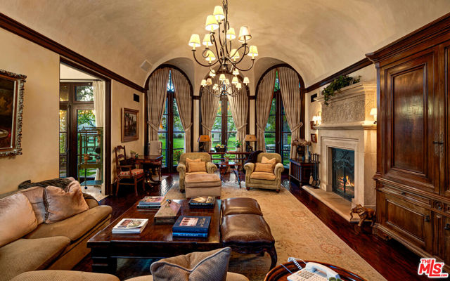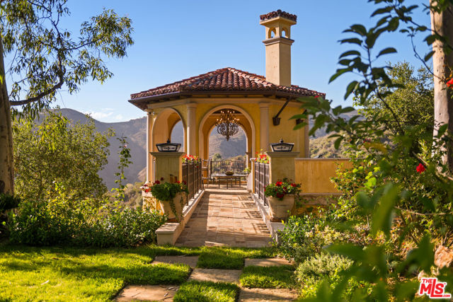 Set within the ultra-exclusive enclave of Brentwood Country Estates, a guard-gated community of just thirteen residences celebrated for 24/7 security, privacy, and sweeping vistas, this remarkable estate evokes the timeless romance of a European chateau. Encompassing approximately 9,400 square feet of living space on an expansive 6.13 acre lot, the property offers a rare combination of seclusion, scale, and architectural elegance. A private gate opens to a stately gravel motor court, instantly transporting you to the Tuscan countryside. Beyond an arched entry, a central courtyard unfolds, where vined walls, manicured gardens, a serene fountain, and flagstone pathways create an atmosphere of refined tranquility. Inside, the residence reveals exceptional craftsmanship throughout, featuring intricate marble floors, soaring ceilings, and the classic proportions of a true European manor. A dramatic two-story formal living room with stone fireplace and coffered, beamed ceilings flows seamlessly into an elegant formal dining room. The chef's country kitchen is anchored by a substantial center island, professional-grade appliances, and opens to both a charming breakfast room and an inviting family room with fireplace. A richly appointed wood-paneled office and library, two powder rooms, a guest suite, a generous playroom or bonus room, and a large, dedicated storage space thoughtfully positioned between levels enhance the functionality of the main residence. Upstairs, the primary suite serves as a private sanctuary, offering a fireplace, walls of French doors opening to a romantic terrace, dual custom walk-in closets, and a luxurious spa-like bath. A dedicated gym and three additional en-suite bedrooms provide comfort and flexibility. The resort-quality grounds are truly exceptional, featuring expansive lawns, covered patios, a sparkling pool and spa, and a rotunda gazebo crowning the landscape. Below the gazebo, a temperature-controlled wine cellar and tasting room accommodating approximately 1,000 bottles create an intimate setting for entertaining. From nearly every vantage point, sweeping canyon and ocean views stretch endlessly, forming a breathtaking natural backdrop. A rare offering of grace, grandeur, and security, 12721 Chalon Road is a world-class European retreat nestled in the heart of Brentwood.