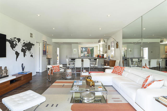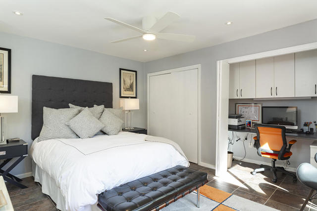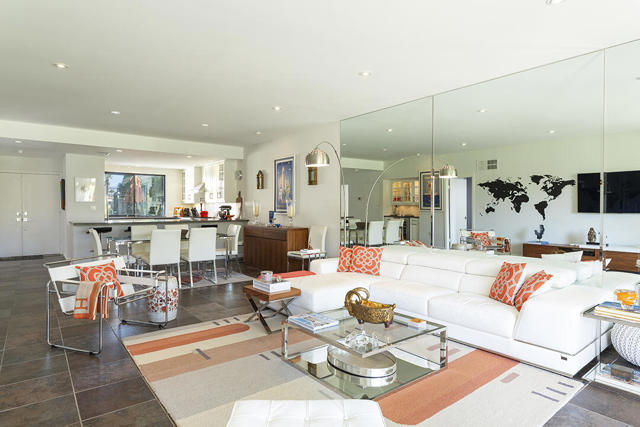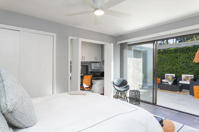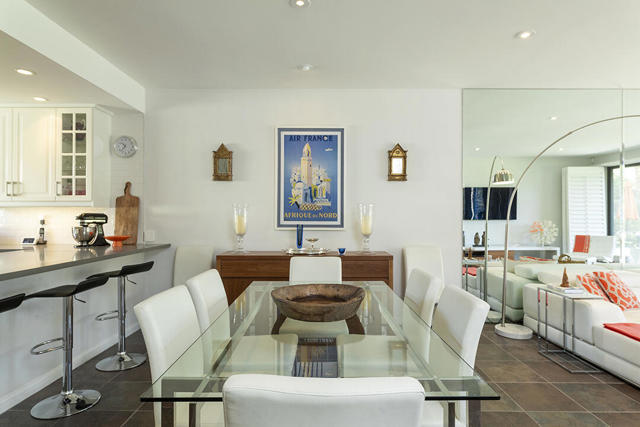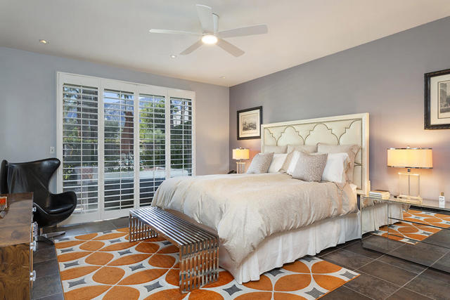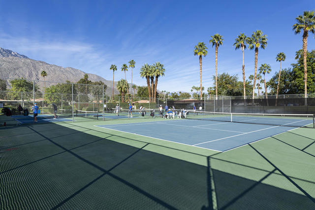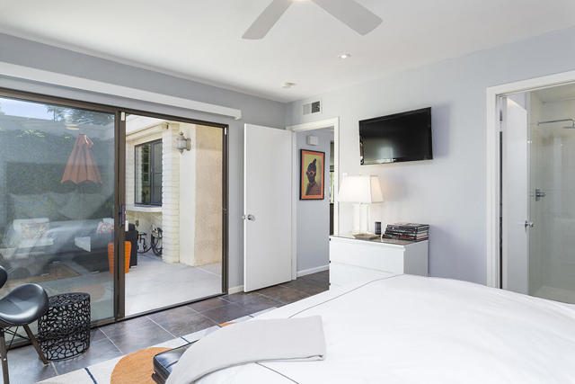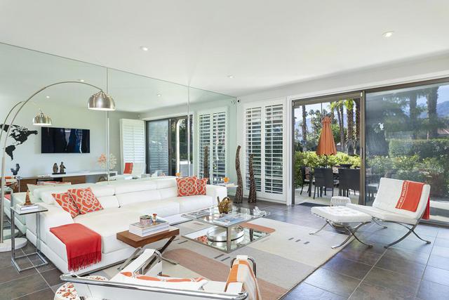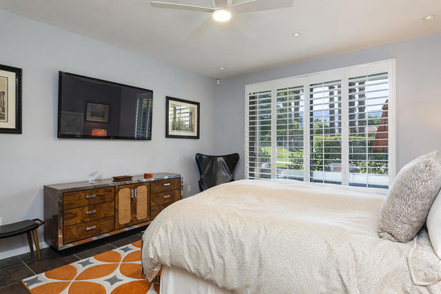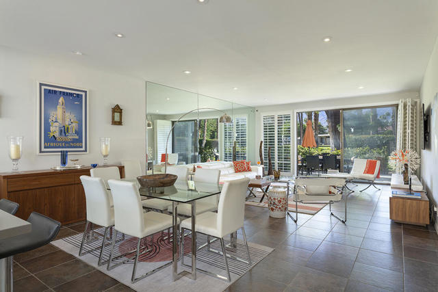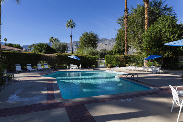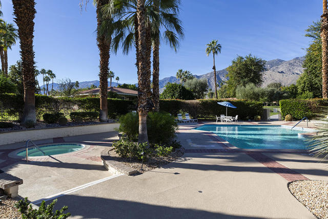 This updated two-bedroom condo in Palm Springs' sought-after Sunrise East community stands out for its generous floor plan, prime location with exceptional views, and a professionally redesigned kitchen that creates a true open-concept great room. During the 2018 renovation, a structural metal beam was added to fully open the kitchen to the living and dining areas. The result is a continuous entertaining space that flows seamlessly from the private front courtyard entry to the sliding doors leading to the covered rear patio overlooking the community's lush, manicured grounds.The chef's kitchen features crisp white cabinetry, a white subway-tile backsplash, gray Caesarstone countertops, and a suite of stainless steel appliances. A dine-in prep island defines the kitchen and dining areas, and a small bar with illuminated cabinetry sits just off the entry hall. The combined dining and living areas offer an elegant yet comfortable setting filled with natural light.A wall of windows and sliding doors at the far end of the living room opens to the private rear patio, where you can enjoy views of Sunrise East's garden-like grounds and one of the community's six pools, this one nestled among mature landscaping. Sunrise East also offers two tennis courts and four pickleball courts for residents to enjoy.The primary bedroom includes sliding-door access to the large outdoor patio, providing excellent light and mountain views. Its updated en-suite bath features a walk-in contemporary shower with a bench, dual sinks, and another closet. The second bedroom is located off the entry courtyard with sliding doors to access the seating area. One of its double closets is currently used as a convenient desk nook, and it has an en-suite bath. The bath is configured so that one sink and the toilet can be closed off for hallway access, creating a versatile guest half bath separate from the suite's shower and primary vanity.Stylish and truly move-in-ready, this home offers a low-maintenance, beautifully updated living experience in one of Palm Springs' most desirable gated communities.Additional Items and Amenities Plantation shutters or roller blinds on all windows and sliding doors HVAC installed 7 years ago Newer water heater with recirculating pump | installed 2025 Roof redone by HOA 2024 | Redone flat area and tile roofing over the garage HOA is repainting entire building | February 2026