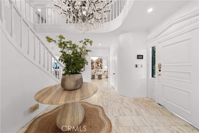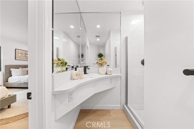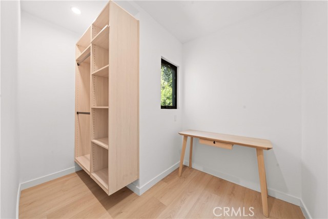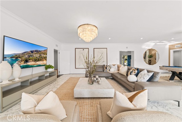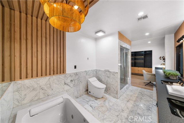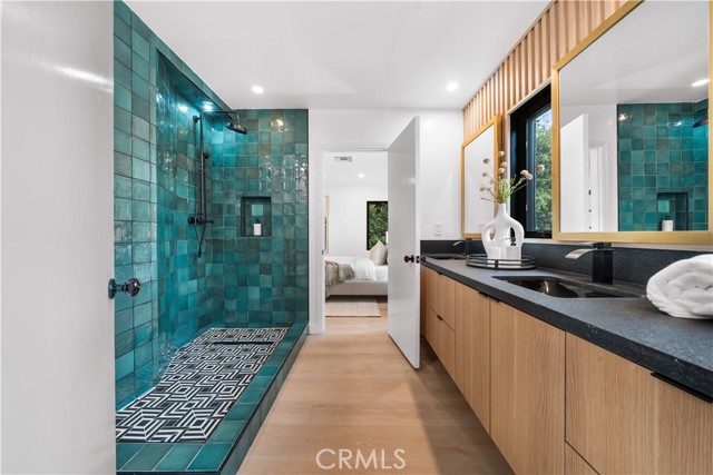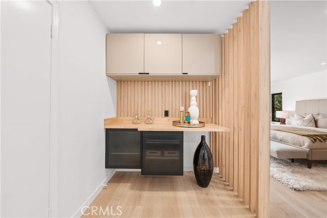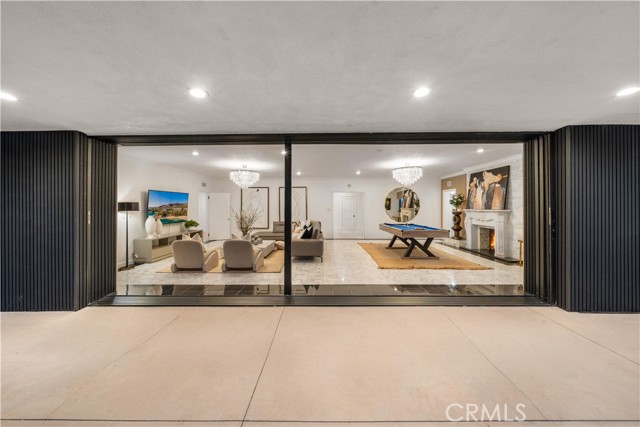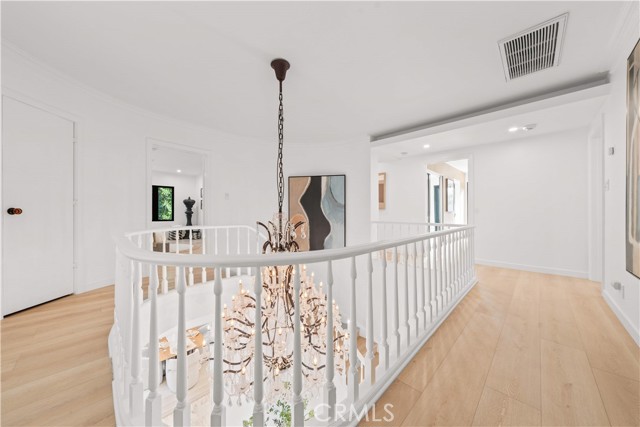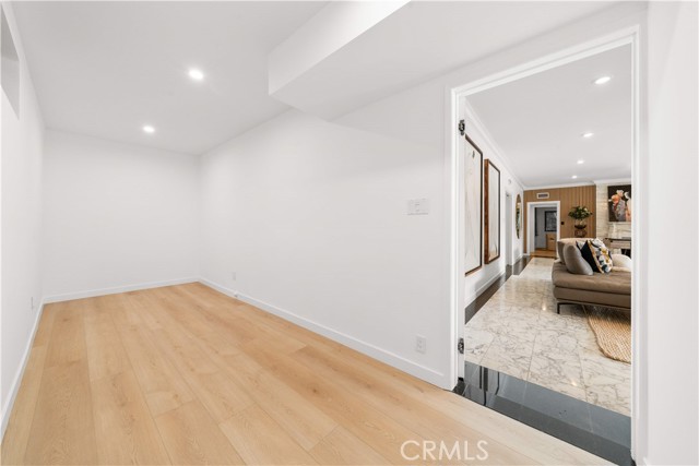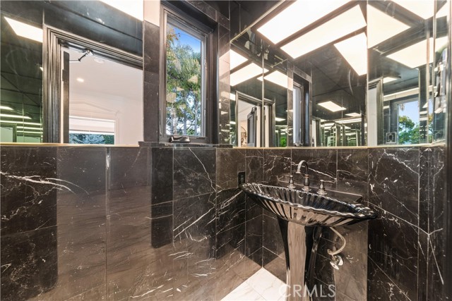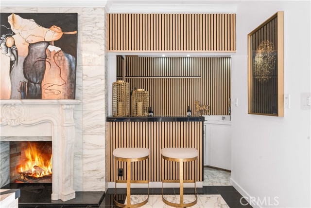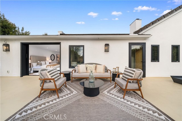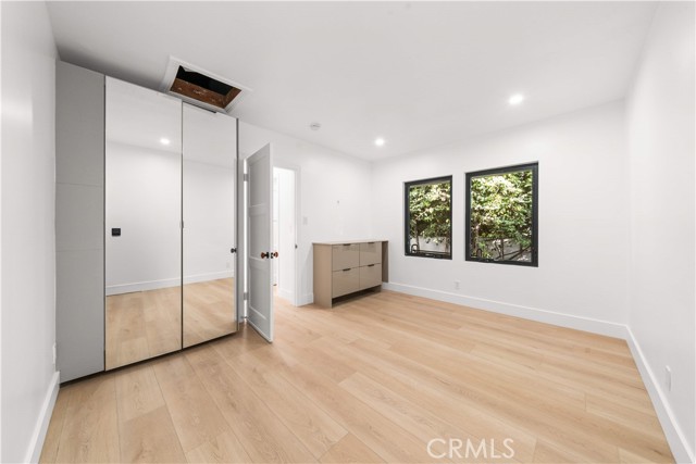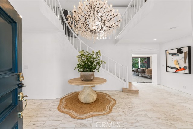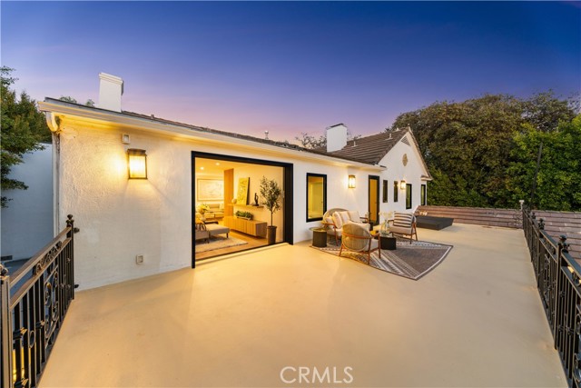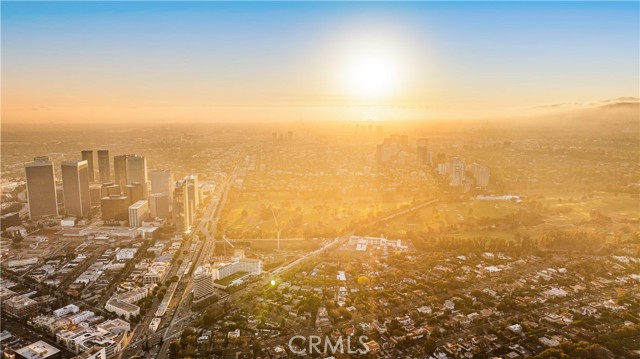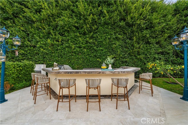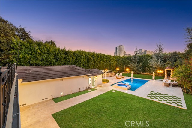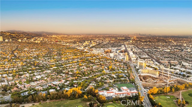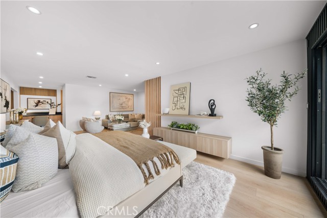 The residence includes five bedrooms, with four located upstairs. The primary suite offers a sitting area, walk-in closets, and an oversized terrace with sweeping views toward Century City. Additional bedrooms are generously sized.