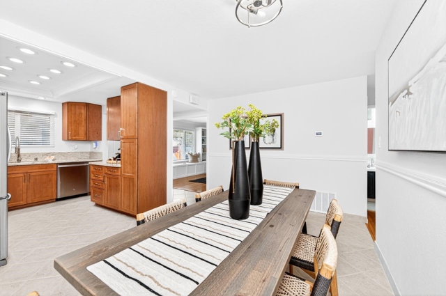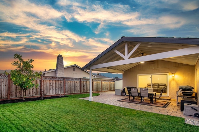 Pottery Barn Perfect......Beautifully maintained single-story home with fresh interior and exterior paint and thoughtful upgrades throughout. The remodeled kitchen shines with stone countertops, handsome cabinetry, tile floors, and a spacious dining area ideal for everyday living and entertaining. Cozy family room with shiplap fireplace opens to an exceptional outdoor retreat—an impressive, covered patio with a gabled roof and pavered patio, perfect for relaxing or hosting guests. The private primary suite features a remodeled bathroom with a walk-in shower, complemented by an updated hall bath with tile flooring. Additional highlights include a newer composition roof, pavered driveway, epoxied garage floor, updated fencing, landscaped backyard, large storage shed, and newer HVAC system. Just a short stroll to neighborhood parks, schools, and shopping. Walk to all three levels of award winning Pleasanton schools Views: Ridge