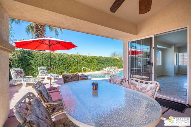 Luxury living with breathtaking golf course and mountain views from this exquisite single-story custom home, nestled on a serene cul-de-sac in the prestigious Jasmine Homes community of South Palm Springs in gated community. Situated on FEE LAND, this stunning 3-bedroom, 3-bathroom residence, complete with an office/den with sky light, exudes elegance at every turn. Step inside to discover soaring high ceilings, elegant tile flooring throughout, and a spacious formal dining area. The expansive living room, framed by a gas fireplace, opens to spectacular views of the golf course. The gourmet kitchen is a culinary masterpiece, featuring top-of-the-line stainless steel appliances, pristine tile floors, and gleaming granite countertops. Adjacent to the kitchen, a private covered patio offers sweeping mountain views and easy access to the sparkling pool and spa, providing an ideal space for relaxation and entertainment. The generously sized primary suite boasts a private retreat with a sliding door that opens to its own tranquil patio. Indulge in the luxurious en-suite bath, featuring walk-in closets, elegant tile flooring, and granite countertops. Bedroom 2 offers ample space and tile flooring, while the guest bath is conveniently located in the hallway. The third bedroom is spacious, complete with abundant closet space, dual sinks, and a walk-in shower. An additional room, perfect as an office, den, or optional 4th bedroom, features natural light from a skylight and double doors for a seamless connection to the rest of the home. The home is further complemented by a dedicated laundry room with extensive cabinetry and a two-car attached garage. The exterior of the home is designed for both relaxation and entertaining, with a refreshing pool featuring mountain views, a mister system for ultimate comfort, and plenty of space for hosting gatherings or enjoying peaceful solitude in this pet-friendly paradise. Close to downtown restaurants & shopping, Starbucks, Agua Caliente Casino, Palm Springs Art Museum, hiking trails and much more. very easy to show contact agent!