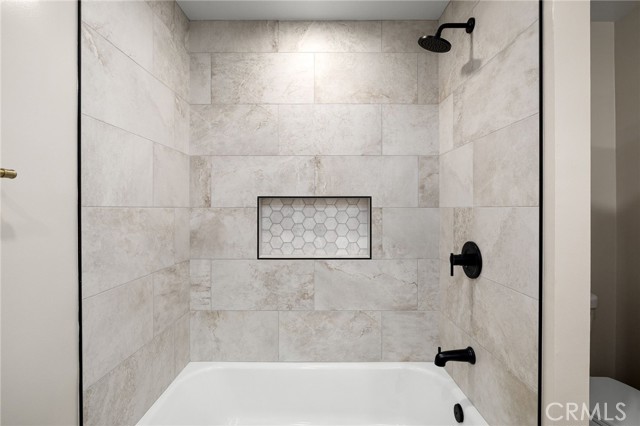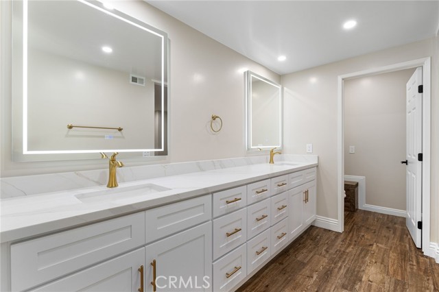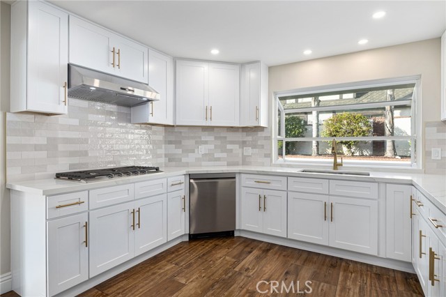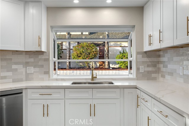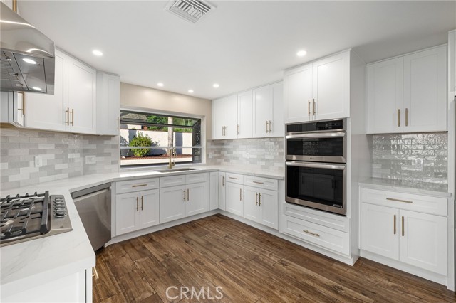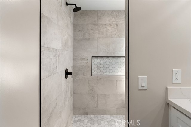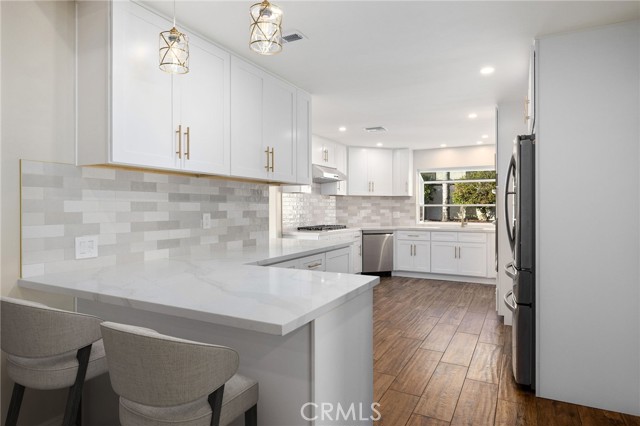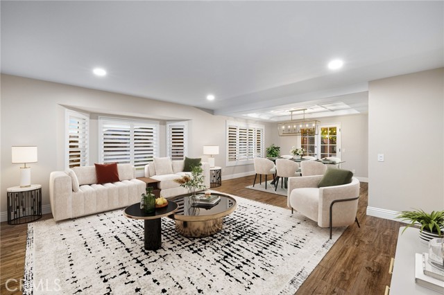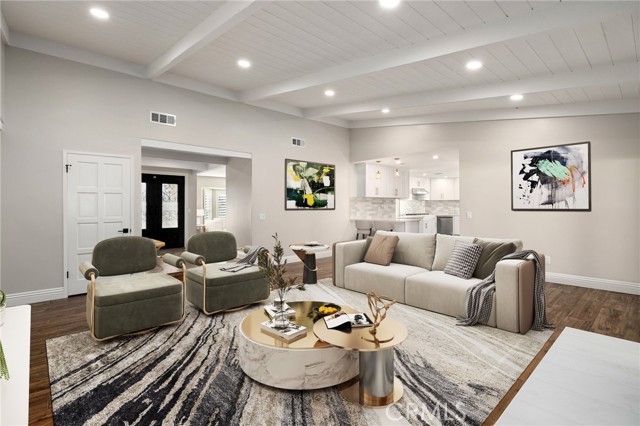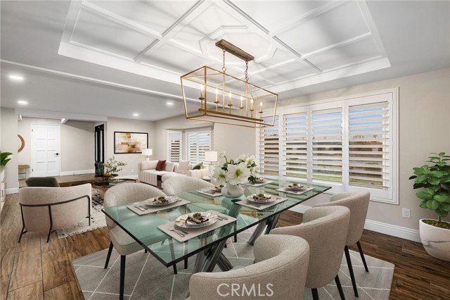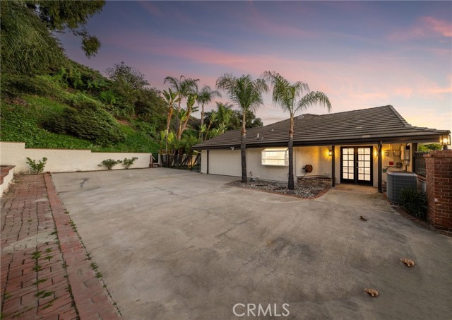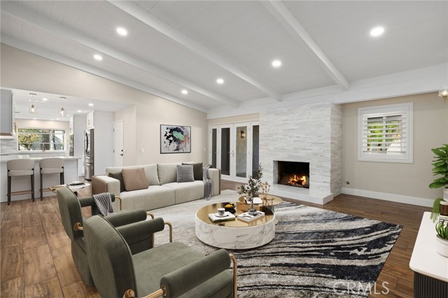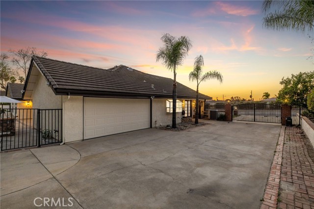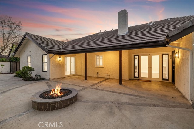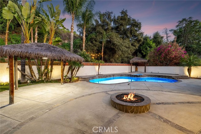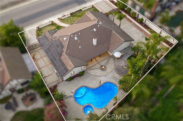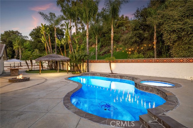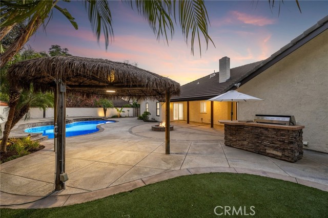 Set against a lush hillside backdrop, this single-story residence offers privacy, scale, and resort-style living. A gated driveway and separate gated RV parking are complemented by stacked-stone planters, brick-accented walkways, and curated landscaping with subtle lighting, creating a composed and welcoming arrival. The front porch introduces brick flooring and architectural lighting, opening through elegant iron-accented double doors into a thoughtfully designed interior. The foyer features herringbone tile, exposed beam detailing, and recessed lighting, with clean sightlines into the home’s primary living spaces. The living room is anchored by a bay window with plantation shutters overlooking the front yard, while the formal dining room is defined by French doors, a coffered ceiling, and a statement chandelier. The kitchen has been reimagined with white shaker cabinetry, quartz countertops, custom tile backsplash, brushed brass hardware, and designer pendant lighting. Stainless steel appliances include a gas cooktop with vent hood, a built-in oven and microwave, and a full-size refrigerator, with a peninsula providing casual seating. The family room offers vaulted beam ceilings, recessed lighting, and a stacked-stone fireplace with raised hearth. French doors open to the backyard, creating a seamless indoor-outdoor connection, with plantation shutters adding architectural continuity and privacy. The primary suite features plantation-shuttered windows, a slider with direct access to the rear patio, a walk-in closet, and a sliding barn door leading to the ensuite bath. The primary bathroom is finished with a long dual-sink quartz vanity, brushed brass fixtures, illuminated mirrors, and a walk-in shower clad in large-format tile with a hex-tile niche detail. Three additional bedrooms offer generous closets and shuttered windows, one with bamboo flooring. The hall bathroom mirrors the home’s finishes with a quartz vanity, modern fixtures, illuminated mirrors, and a tiled shower-tub surround. Outdoors, the backyard is designed as a private retreat with a pool and spa, expansive patios with stone inlays, a covered rear patio, built-in barbecue, and a central fire pit, all framed by mature palms and natural hillside greenery. The wide, fully gated driveway offers ample parking and access to the garage offering epoxy floors, a tankless water heater, and a Tesla charger. Additional upgrades: smooth finished interior drywall, owned solar and blown-in insulation.