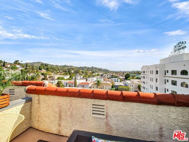 Nestled in the historic Hollywood Dell is this rare top floor 2 Bedroom, 2 Bath with loft, and private rooftop terrace, featuring uninterrupted views to the Hollywood Hills, Griffith Observatory and Hollywood skyline. Perfect space for evening sunsets and cocktails! The light-filled open living area features soaring cathedral ceilings, a generously proportioned kitchen, stunning herringbone wood floors, and wood burning fireplace. Sip your morning coffee here, sitting on the built-in window seat spanning the broad expanse of windows. A perfect place for planning your day or daydreaming! The open 2nd floor loft overlooks the living area with French doors to the terrace. This is a flexible space currently being used as a gym/office and also has hardwood floors. Each bedroom has a bathroom and is positioned to provide maximum privacy ideal for sharing/roommates. This well maintained home has an intelligent layout with generous storage throughout, including front hall closet, linen closet with luggage storage, side-by-side laundry area with storage shelves, large walk-in closet in the primary bedroom and dressing area. The building boasts landscaped public areas with a 2nd level pool and hot tub. The secure indoor parking structure provides this unit with 2 practical side-by-side parking spaces. The location is divine. You can walk to the Hollywood Bowl and Hollywood hot spots! Bronson and Beachwood Canyons are 5 minutes away so you can get your steps in and visit the Batman Caves! The immediate neighborhood flows uphill to serenity, with the Vedanta Center minutes away. If you lived here, you would be home now!