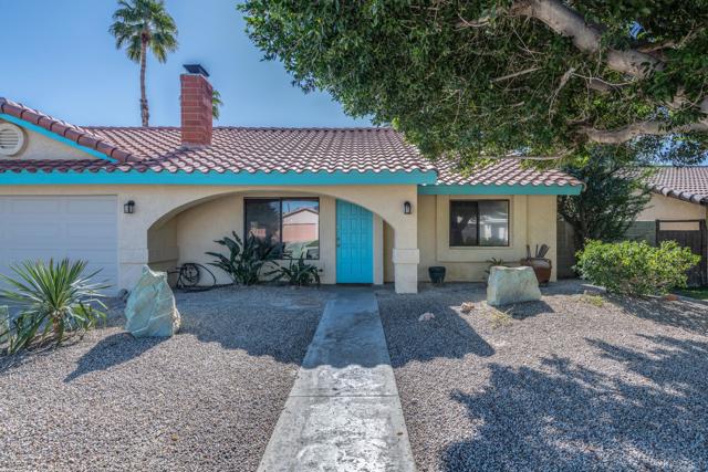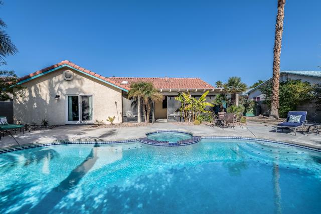 Character and charm abound in this beautiful Spanish style 3 bedroom home nestled on a private and spacious lot with mature landscaping and a sparking pool and spa! This house has a very appealing layout with high ceilings and a dramatic and gorgeous stone fireplace, Italian porcelain tile flooring throughout, Viking appliances in the large open kitchen with tons of seating to host fabulous dinner parties, outdoor BBQ's, wine by the fire, and so much more! The large and inviting primary suite with new windows and sliders gives you an amazing view of your lush new backyard and pool. The primary bedroom is completed by a huge walk in closet and an ensuite bathroom. This home has it all! It has been well maintained with upgrades like all new interior and exterior paint, drought tolerant landscape front and back, new French doors to the screened in pergola designed for al fresco dining, new dishwasher, wine cooler plus a list of upgrades to give you a sense of comfort and ease! The popular Rio Vista neighborhood is just 10 minutes from downtown Palm Springs, the airport, restaurants and shopping in Cathedral City, parks, and golf and tennis clubs are very close by as well! This stellar property is not to be missed!