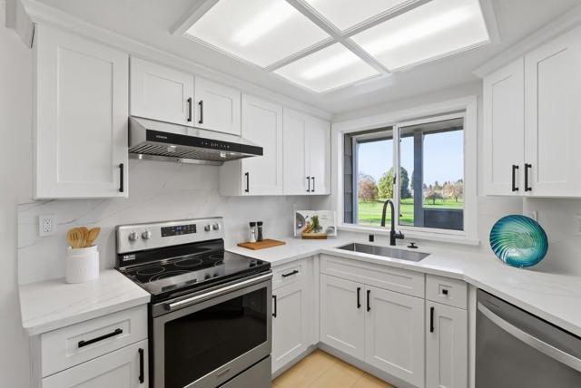 A warmer end of unit condo home , located at a well maintained complex in North Valley San Jose. 2nd floor & grand floor plan. The end of unit bright with nature light daily, Recently replaced new luxury vinyl floors through out, New cabinets at Kitchen & BAthrooms, New quartz counter tops at kitchen, New stainless steel appliances: Stove, Cooking fan , Dishwasher, Refrigerator, Disposal. Double pane windows, Recessed lights. Fresh painted interior walls. & ceilings. Move in ready. One car detached garage # 107. Community club house & pool. Facing goulf course with great privacy. Near Costco, Post Office, Ranch 99 & H Mart supermarket, BART Station, Super Microw. Easy to access HYW 880, 680 & 101
