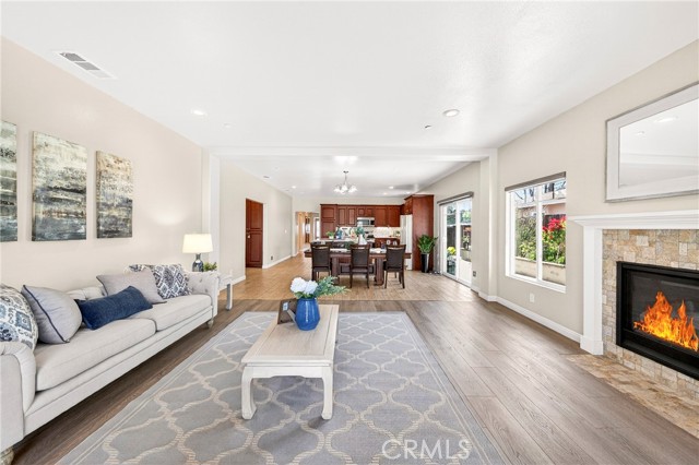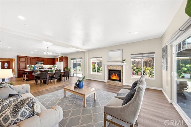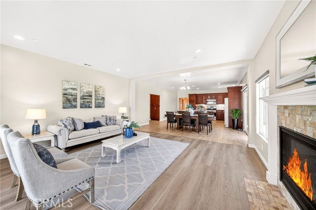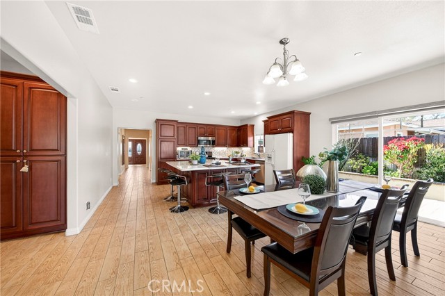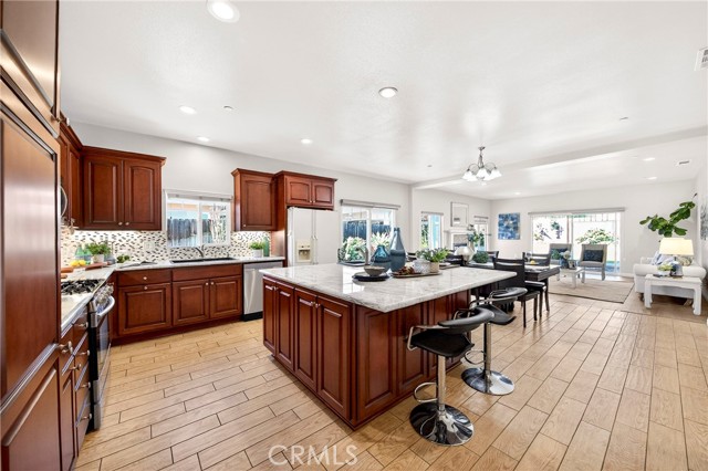 The kitchen is seamlessly connected to the dining and family areas, creating a spacious great-room concept ideal for everyday living and entertaining. It is equipped with granite countertops, a large center island with a convenient prep sink, stainless steel appliances, and recessed lighting throughout the kitchen, hallway, and great room.