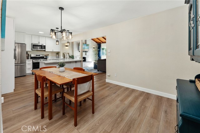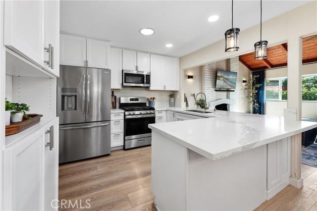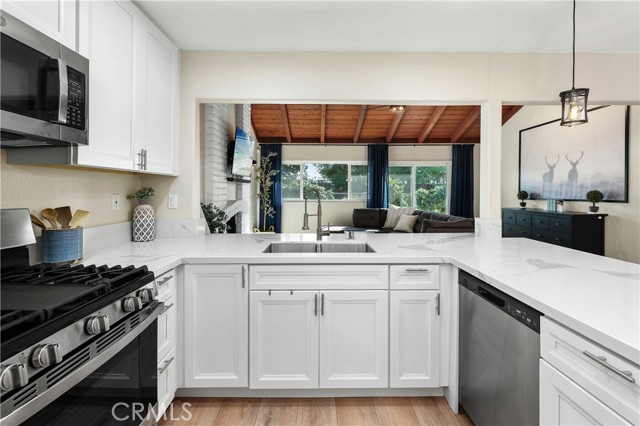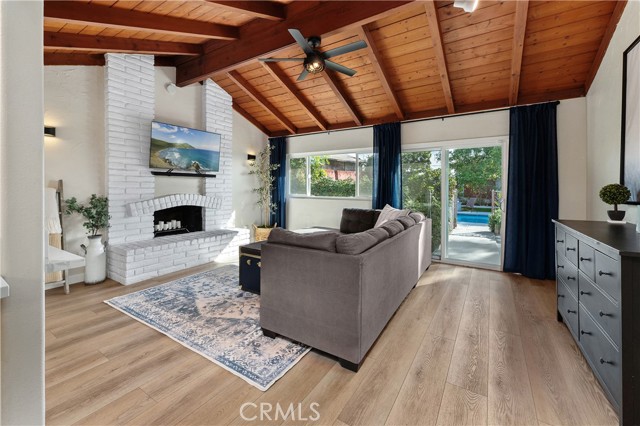 The open-concept kitchen and dining area flow seamlessly into the expansive family room, which is highlighted by a vaulted wood ceiling with exposed beams and filled with natural light from updated dual-pane windows and a sliding glass door overlooking the backyard. The redesigned kitchen features quartz countertops, crisp white cabinetry, and stainless steel appliances, creating a clean, timeless space ideal for both everyday living and entertaining. In addition to the main living area, a separate living room with a cozy fireplace provides an additional retreat, perfect for quiet evenings.
