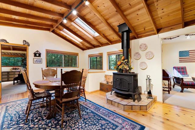 This sweet home is bursting with mountain charm! Tucked within the desirable residential community of Forest Lakes, this thoughtfully constructed two-bedroom, two-bathroom home is surrounded by majestic redwood trees and located near a private, seasonal recreational pool. The home features pine wood flooring, two well-appointed bedrooms each with en suite bathrooms, and a private deck off the primary bedroom. An office nook off the living room provides flexible workspace, while a functional wood-burning stove adds warmth and ambiance to the living area. The seller would like to sell fully furnished!