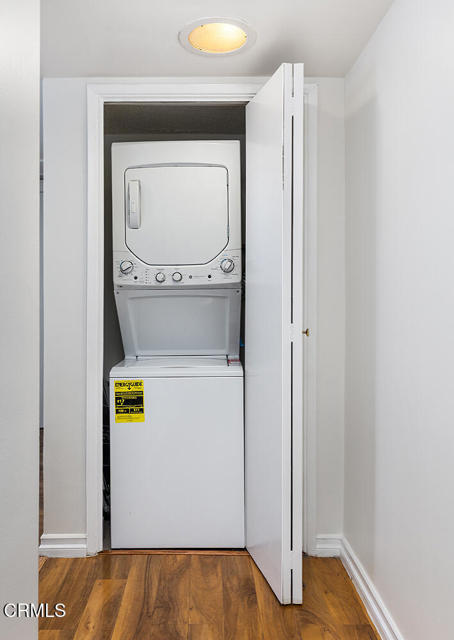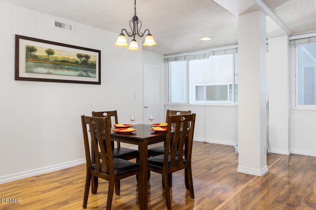 Right in the heart of UCLA proud sits this handsome second-floor condo, one of 26 units in a well kept five-story building. 23 of the 26 units are rentals, mostly for UCLA students. The first impression upon entering this corner unit is how expansive it feels, with 9-foot ceilings and open floor plan. The living room/dining room is flooded with natural light from a wall of vinyl, double pane, UV coated, sliding glass picture windows with medium-blade Venetian blinds for privacy. The floor gleams with its wide-plank, wood laminate flooring. There is also classy crown and baseboard molding. The dining area could easily handle six for dinner. There are built-in contemporary wood cabinets. The galley kitchen includes an electric Schott Ceran stovetop and oven, Frigidaire dishwasher, Frigidaire refrigerator, and built-in, stainless steel Frigidaire microwave. There are plenty of contemporary wood cabinets, including a pantry closet. The counters are a sparkly midnight quartz with sea foam, subway glass tile backsplash and a double, stainless steel sink with gooseneck faucet. There are two bedrooms each with their own full bathroom. The master is spacious with plenty of natural light from vinyl, double pane, UV coated windows with medium blade Venetian blinds for privacy. There are not one, but two large closets with large mirror, sliding doors and a ceiling fan/light. The bathroom has sea foam, subway glass tile walls, ceramic tile floor, a granite top vanity, shower over tub, and a Kohler toilet. The second bedroom also has a ceiling fan/light, one large closet with mirror, sliding doors. It's bathroom is fantastically lit by opaque windows. There's a shower over bath, Kohler toilet, a Decolav porcelain basin sink set atop a granite top vanity and ceramic tile flooring. A guest bathroom is situated in the foyer with ceramic tile floor, a Kohler toilet and granite top vanity. The hallway includes a laundry closet with stacked GE washer/dryer, as well as a closet with sliding mirror doors. Each room has a Toshiba portable air conditioner. The condo also includes a spacious storage closet in the basement, a single parking space in a secured garage, outdoor pool and picnic area. HOA fees include water, trash, grounds maintenance and earthquake insurance. Location is near Westwood Village and 405 interstate. Such an ideal condo in an ideal location.