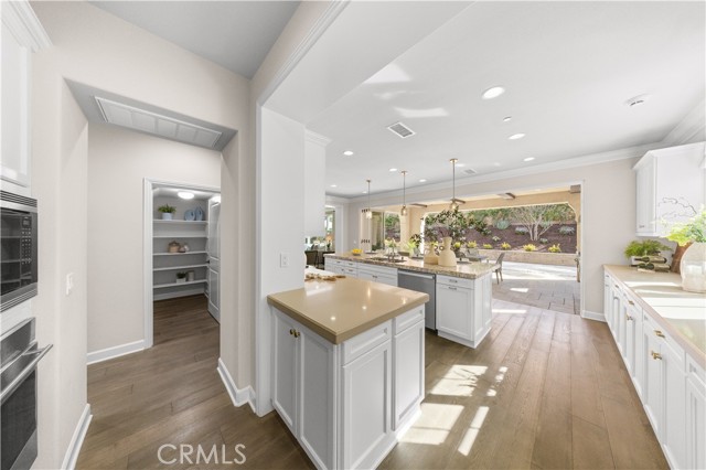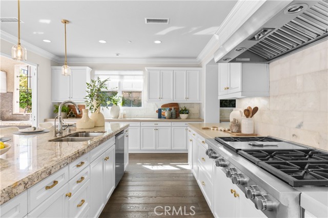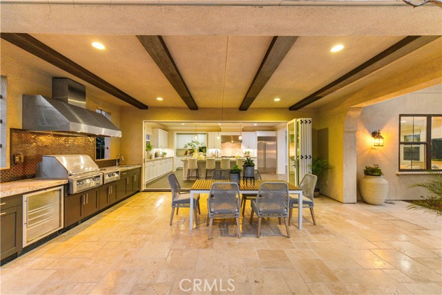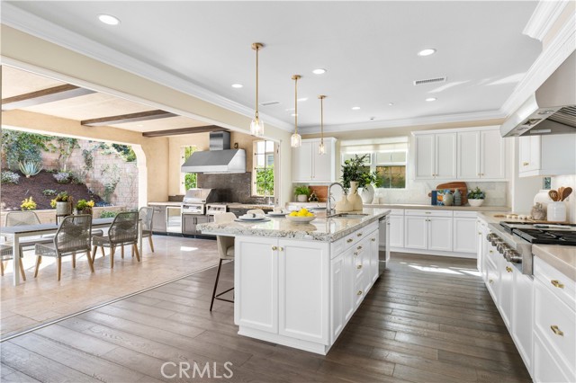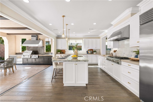The ground-floor suite, conveniently located to the left of the foyer, features a private bathroom, walk-in closet, and kitchenette. A private entrance leads to a brick-paved leisure area in the side courtyard. Pass through the gracefully arched doorway into the bright and open dining and living space, where abundant sunlight filters through large windows. The remarkable kitchen is a chef's dream, featuring a vast marble-topped island, quartz countertops and full backsplash, top-of-the-line Wolf stainless steel appliances, and a high-end built-in Sub-Zero refrigerator. A wall-sized bi-folding glass door seamlessly connects the kitchen to the courtyard's outdoor living area, complete with a full set outdoor kitchen, barbecue, gas stove, hood, sink, beverage cooler, and stainless steel cabinets, catering to all entertainment needs. The garage entrance features a mini office space, right next to a spacious walk-in pantry. Garage itself boasts custom cabinets with a workbench and shoe cabinet, maximizing storage space and convenience.The second floor hosts four bedrooms and a loft area. The loft features a customized TV cabinet, serving as an ideal family recreation space. The laundry room features a sink, drawer-style ironing facilities, extra-long countertop, and an abundance of cabinets. The master suite, overlooking the courtyard, enjoys ample natural light and panoramic views. The spacious master bath features double sinks, a walk-in shower, and a spa-inspired bathtub . The spacious walk-in closet features custom storage cabinets, and the hallway boasts custom multi-drawer cabinets for ample storage. The other secondary bedrooms also enjoy abundant natural light, while the junior suite includes a bathroom, a walk-in closet, and a mini lounge area.