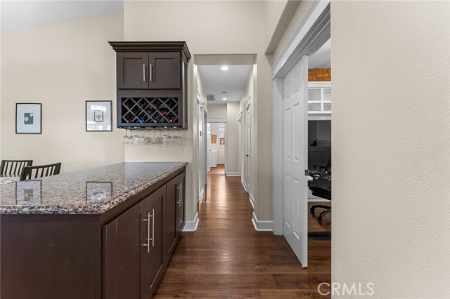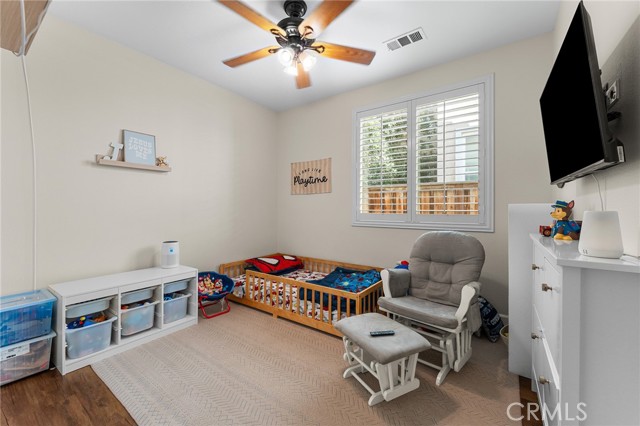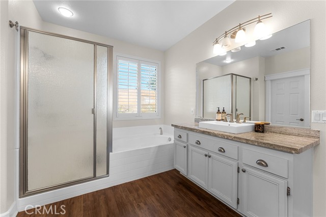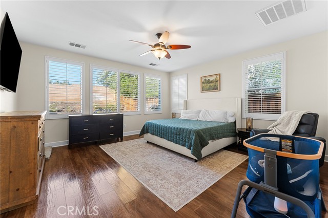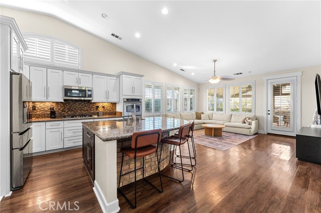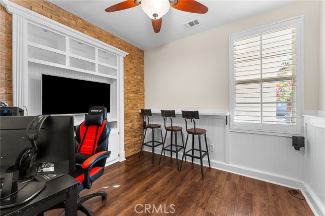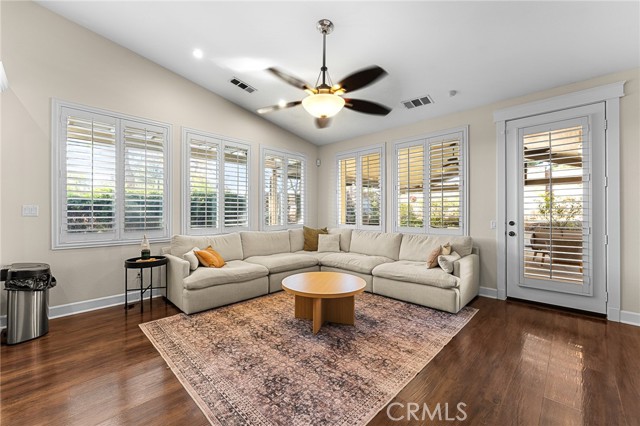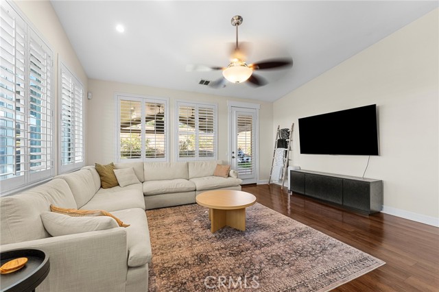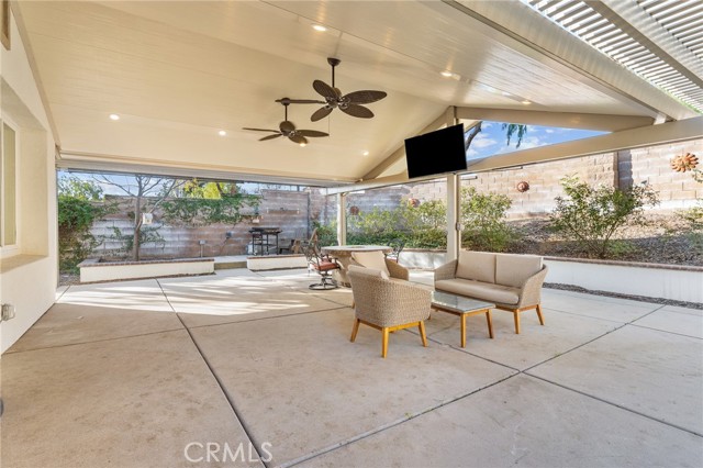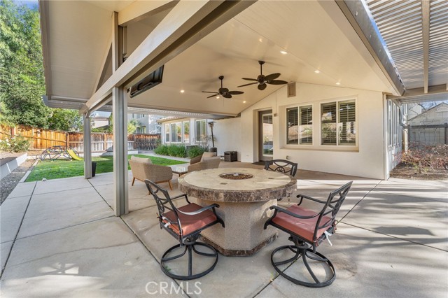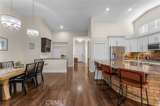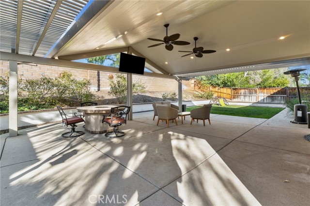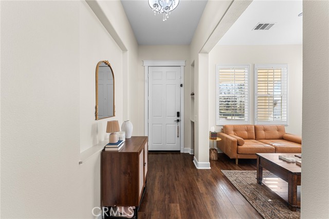 Welcome to this beautifully well-maintained in the gated community of Tournament Hills. This home blends modern upgrades with serene living. Inside, you’ll find granite countertops, luxury vinyl flooring throughout, elegant plantation shutters, and a stylish kitchen backsplash that complements the custom island, creating a space that’s both functional and inviting. Thoughtfully designed accent walls throughout the home add character and a custom touch.Step outside and fall in love with the custom hardscape and massive patio cover, professionally pitched with a matching roof for seamless design. The outdoor living space is ideal for entertaining, featuring a dedicated seating area with a built-in fire pit—perfect for relaxing evenings under the stars.