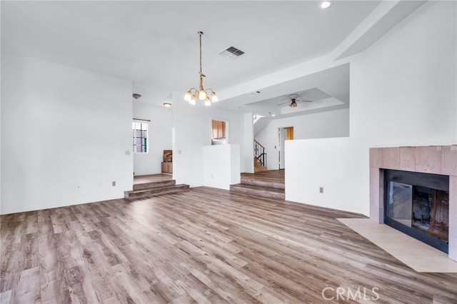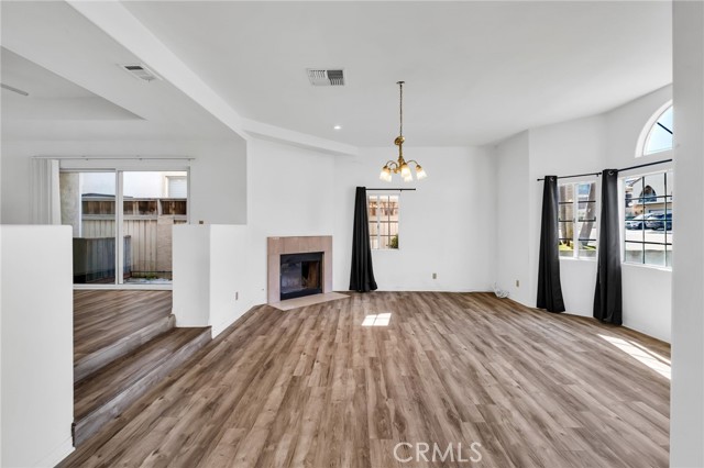 The step-down living room is warm and welcoming, featuring a gas fireplace, desirable ceiling height, and abundant natural light from west-facing windows. The large formal dining room flows seamlessly to a side patio through sliding glass doors—perfect for outdoor grilling and al fresco dining.