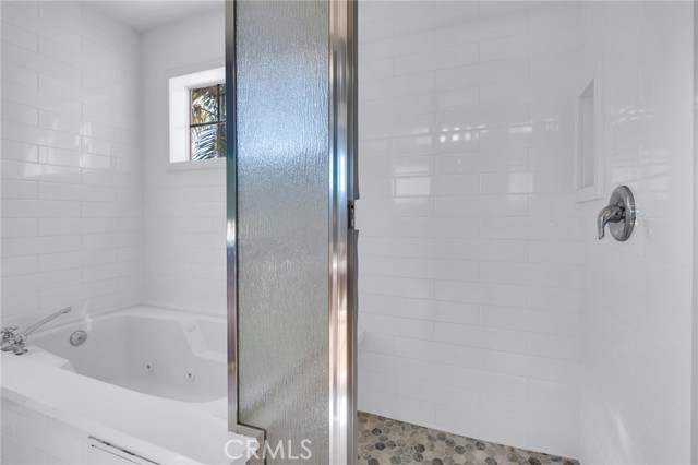 Upstairs, you’ll find two additional bedrooms, including a bright northwest-facing bedroom and a spacious primary suite with double-door entry, walk-in closet, and en-suite bath. The primary bathroom has been tastefully updated with a spa tub, tiled floors, and tiled tub surround, offering a relaxing retreat.