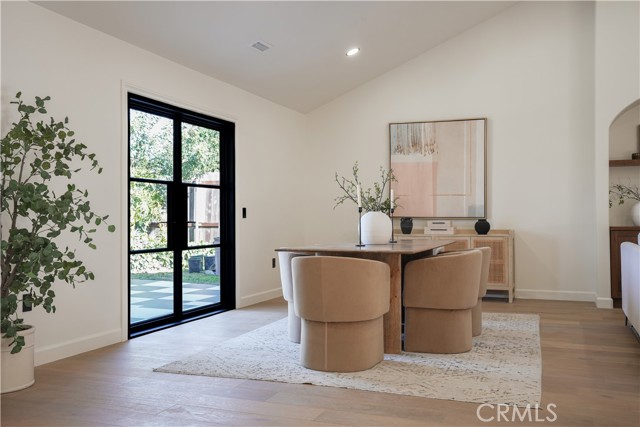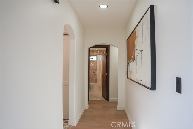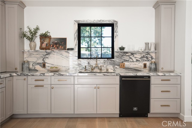 The kitchen features custom European marble countertops, a spacious walk-in pantry, European-styled appliances, and seamless flow into an expansive vaulted living area highlighted by a custom fireplace chimney and arched built-in cabinetry. Engineered white oak flooring, French-style windows, steel double entry and rear doors, and a charming Dutch door from the bedrooms to the backyard elevate both form and function. Thoughtful upgrades include all-new plumbing with a newly completed main drain, providing peace of mind and modern efficiency.