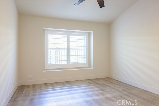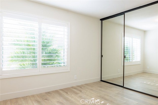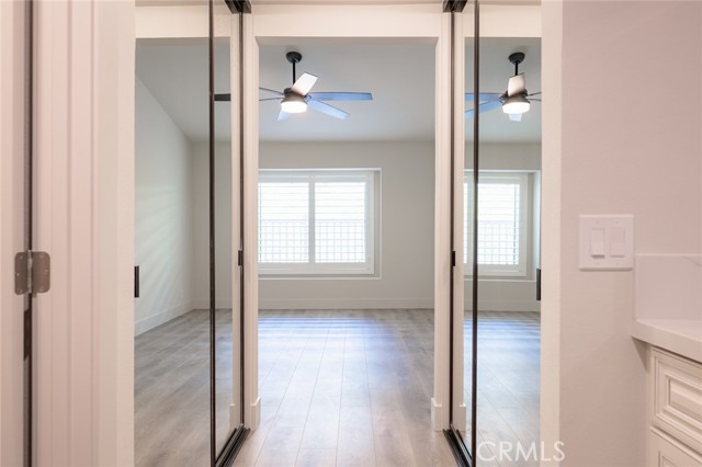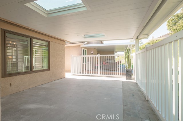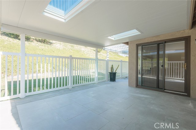 The primary bedroom offers dual mirrored closets and a ceiling fan. Secondary bedrooms provide flexible living space with access to the side patio. The enclosed wrap-around patio includes custom tile flooring and dual skylights, offering a bright and inviting area for year-round enjoyment while overlooking the adjacent greenbelt and landscaped hillside.