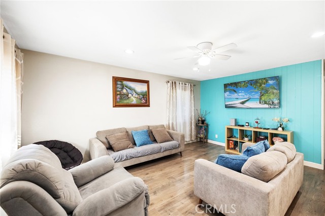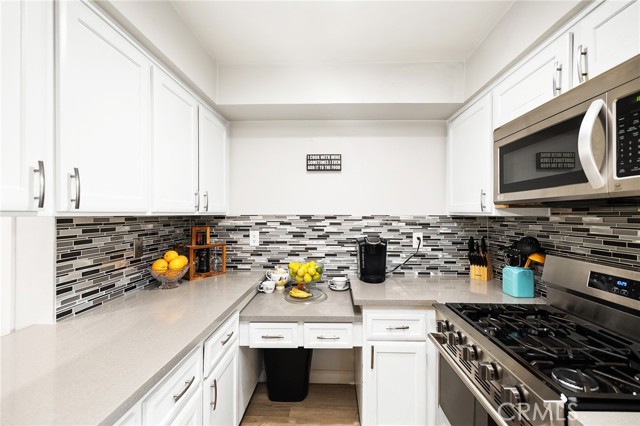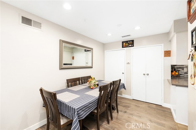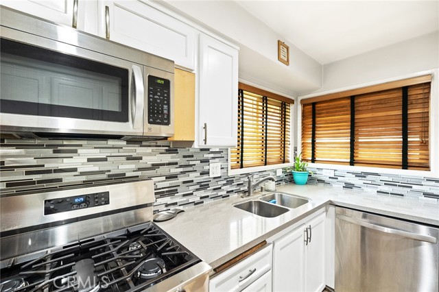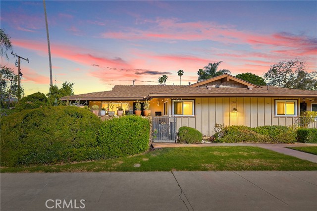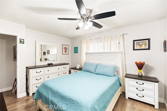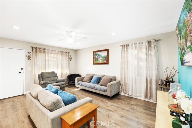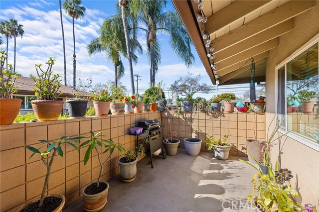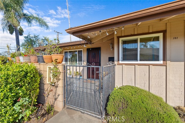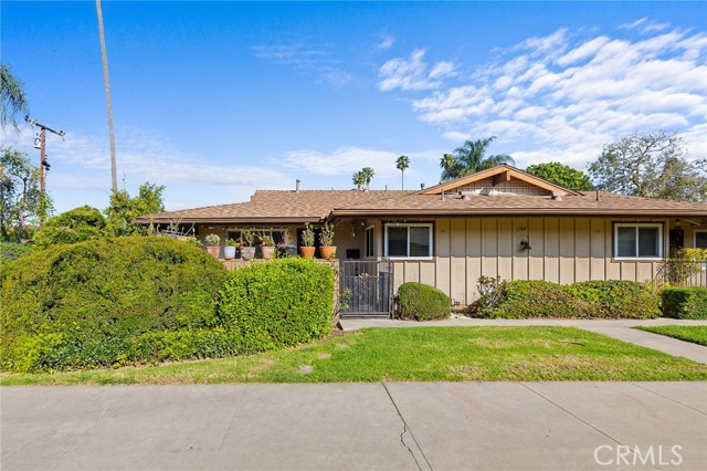 Fabulous Condo in the beautiful Coco Palms Community, featuring two spacious bedrooms and two bathrooms, along with the added convenience of a private one-car detached garage. This desirable single-story, end-unit offers privacy and comfort in a well-maintained residential setting. The inviting kitchen showcases quartz countertops, a stylish backsplash, white cabinetry, and stainless steel appliances—perfectly blending function and modern design. The separate living room and dining area create an ideal layout for both everyday living and entertaining. Laminate flooring flows seamlessly throughout the home. Both bathrooms come with tile flooring and have been tastefully updated. Both bedrooms offer large closets with mirror doors and ceiling fans. Large living room with lots of natural light and a ceiling fan. This home also offers central air conditioning and heating, providing year-round comfort. Enjoy a charming front porch/patio, ideal for relaxing or hosting guests. The community offers a sparkling pool, a secondary Kids pool, barbecue and picnic areas, and beautifully landscaped walkways with lush greenery throughout. HOA dues include water, sewer, and trash for added value and convenience. Excellent location close to freeways, shopping, restaurants, schools, and entertainment. This is a wonderful opportunity to own a turnkey home in a desirable community.