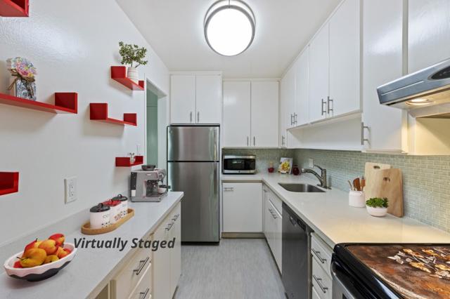 Rejuvenated contemporary one bedroom/one bathroom condominium in the highly sought after Woodlake community. This private light-filled unit features over 693 sq/ft of open concept floor space with its own 300+ sq/ft private patio/balcony. The updated kitchen features stainless steel appliances, modern quartz countertops with glass tile backsplash and stylish cabinets. Tons of upgrades include LED lighting, designer plank flooring, assigned covered parking with extra parking space, extra cabinet space/storage and much more! An updated bathroom and large bedroom round out the main living space. Woodlake is a resort-style community with six pools, large gym, saunas/spas, four lighted tennis courts, clubhouse, and large lake with walking paths. Conveniently situated near major transport links, downtown Burlingame/San Mateo shopping and dining, and minutes from SFO.