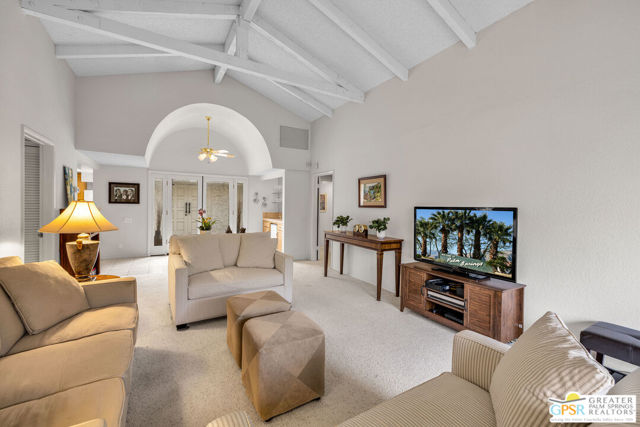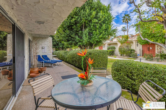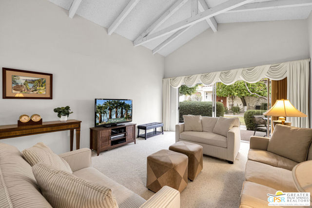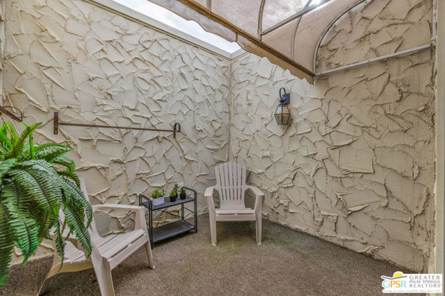 Rare opportunity to own in the coveted Villa Alegria community, where residences rarely come to market. This 1,599 sq. ft. end unit features a dramatic vaulted ceiling in the living room and a thoughtfully designed layout that provides exceptional separation between the primary suite and the ensuite guest bedroom. Highlights include a wet bar with refrigerator, in-unit laundry closet, private courtyard entry, and a generous patio accessible from both bedrooms and the living area. One designated carport space. Offered furnished per inventory list. Villa Alegria is an intimate, gated enclave of just 39 residences, ideally situated near the historic Araby Cove area of South Palm Springs. The beautifully maintained grounds feature lush citrus trees, three sparkling pools, and three relaxing spas. Located on Fee Simple land - you own the land. Monthly HOA dues include building and grounds maintenance, cable TV, trash, water, and community amenities. Ideally located near world-class golf, hiking, dining, shopping, downtown Palm Springs, and PSP, this is a rare opportunity to own in one of the area's most sought-after communities.