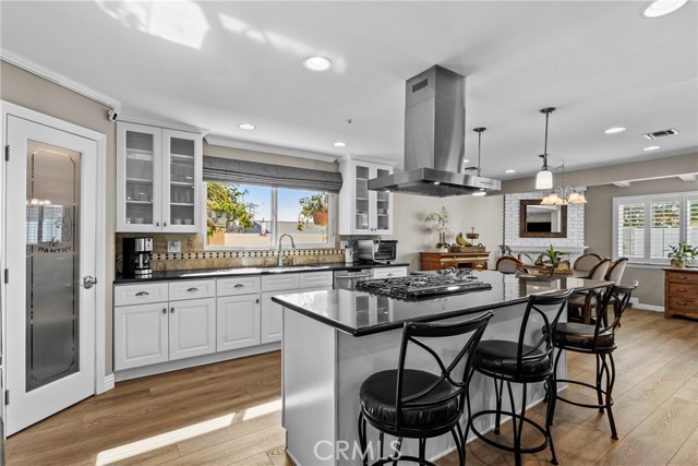 The stunning kitchen showcases modern white cabinetry, sleek black granite countertops, a five-burner stove with griddle attachment, stainless steel vent hood, stainless steel appliance package and a newer refrigerator — perfectly blending timeless design with everyday functionality.