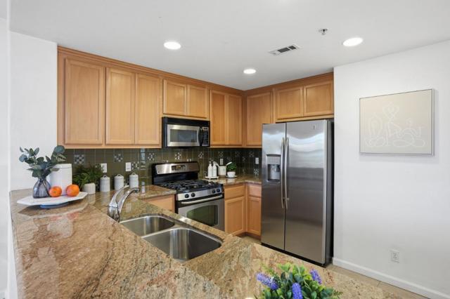 Beautifully updated, light-filled Mediterranean-style end-unit condo with serene greenbelt views, nestled in the highly desirable Spyglass Hill Community. This inviting home features high ceilings and an open-concept floor plan, enhanced by abundant windows that flood the space with natural light. The kitchen is thoughtfully designed with granite countertops, stainless steel appliances, including a gas range/oven, microwave, refrigerator, and dishwasher, and a convenient breakfast bar ideal for casual dining or entertaining. The spacious primary suite offers a relaxing retreat with dual vanities and an oversized walk-in shower. Step outside to the front patio to unwind and enjoy peaceful greenbelt views. Additional highlights include a stackable washer and dryer in the hallway laundry closet, central air conditioning, a separate storage closet, and a two-car tandem garage with additional ample storage space. The community is surrounded by lush greenbelts and offers a playground, hiking trails, and a nearby park, making it perfect for an active, outdoor lifestyle. Conveniently located with easy access to Highways 87, 280, and 101, public transportation, the nearby Plant Shopping Center with shops and restaurants, and just a short drive to downtown Willow Glen.