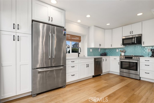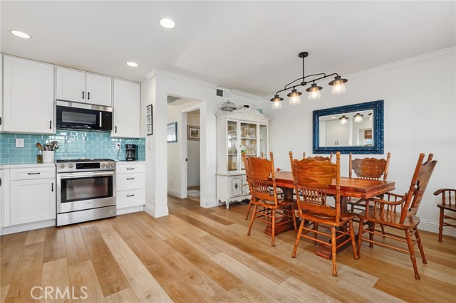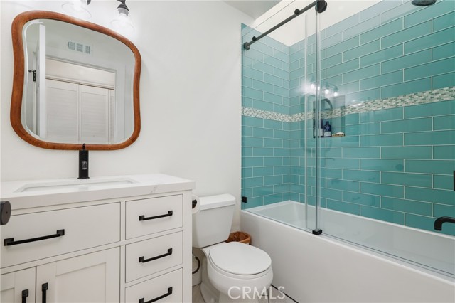 The newly remodeled kitchen shines with quartz countertops, a beautiful coastal blue glass tile backsplash, new shaker cabinets and drawers, stainless steel appliances, and a new microwave. Sliding glass doors lead to a private patio with direct gate access to a large greenbelt, perfect for pets or outdoor enjoyment. The patio also features a new tankless water heater.