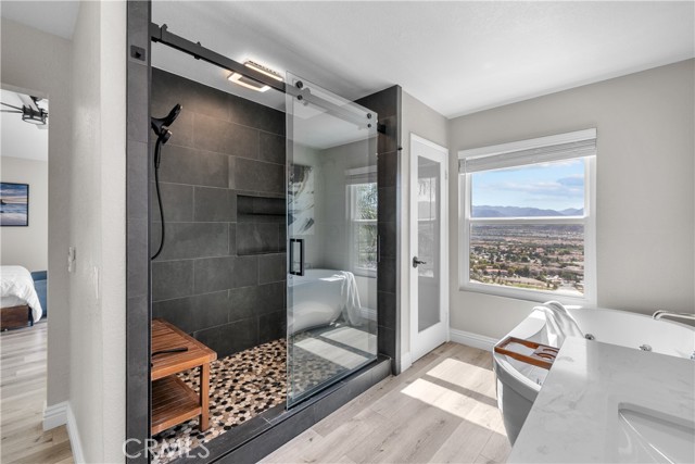 Hello Views! Welcome to the highly desirable Shangri-La neighborhood in Canyon Country! This move-in ready home has been completely remodeled with modern finishes, smart-home features, and energy-efficient upgrades throughout. The open floor plan creates a bright and spacious feel, highlighted by luxury laminate flooring, custom steel stair railing, new baseboards, and fresh interior paint. The chef’s kitchen is a standout with custom cabinets, a commercial-grade double oven, and quartz countertops, offering plenty of space for cooking and entertaining. The primary suite feels like a private retreat with a large walk-in shower, glass enclosure, whirlpool tub, and updated vanity. All bathrooms have been upgraded with new fixtures and finishes.