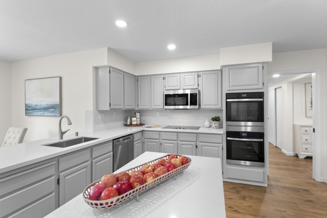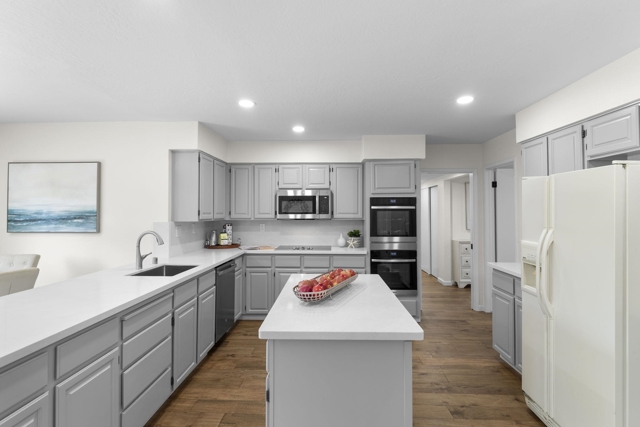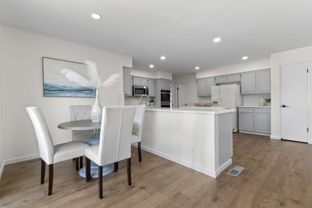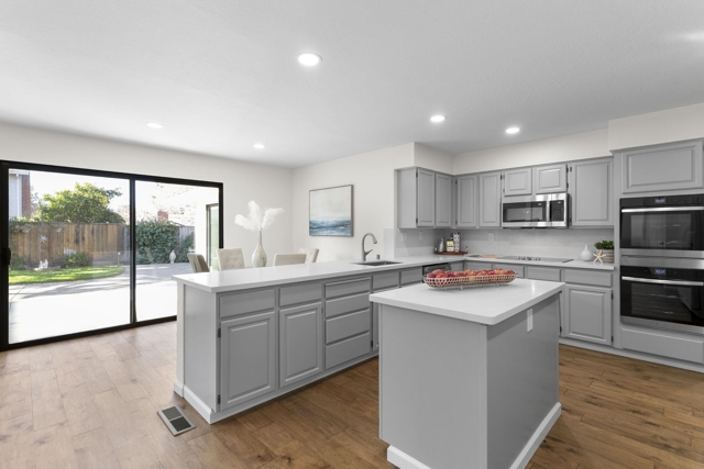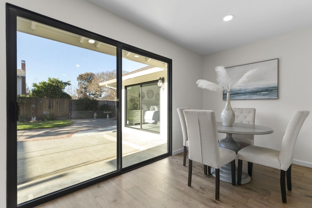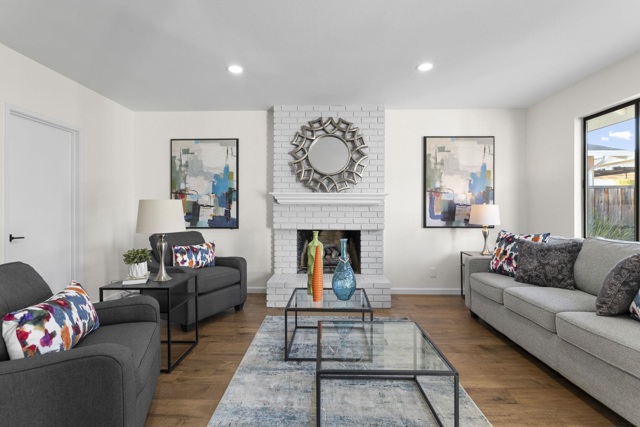 Welcome home to this beautifully updated single-level residence in a desirable Pleasanton neighborhood. Recently renovated with brand-new flooring and fresh interior paint throughout, this home is bright, clean, and move-in ready. The flexible floor plan offers multiple living spaces, including a welcoming living room and a separate family room with a cozy gas fireplace, ideal for everyday living and entertaining. The updated kitchen features new countertops, new appliances, ample cabinetry, and flows into the family room and breakfast nook. A dedicated dining room provides additional space for gatherings. The home offers 4 bedrooms and 2 bathrooms, including a private primary suite set apart from the secondary bedrooms. Sliding glass doors create a seamless connection to the private, courtyard-style backyard with expansive patios and a built-in brick barbecue—offer the ideal setting for outdoor dining, entertaining, or simply enjoying Pleasanton’s beautiful weather. Additional features include central heating and air, a roll-up garage door with opener, and approx. 2,100 sq. ft. Minutes from I-580 / I-680, offering easy commuter access while nestled in a peaceful neighborhood close to hiking trails, parks, downtown Pleasanton shopping & dining, award-winning schools & healthcare.