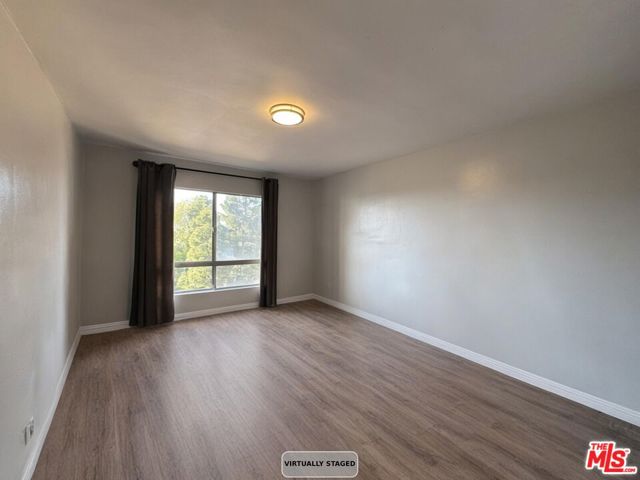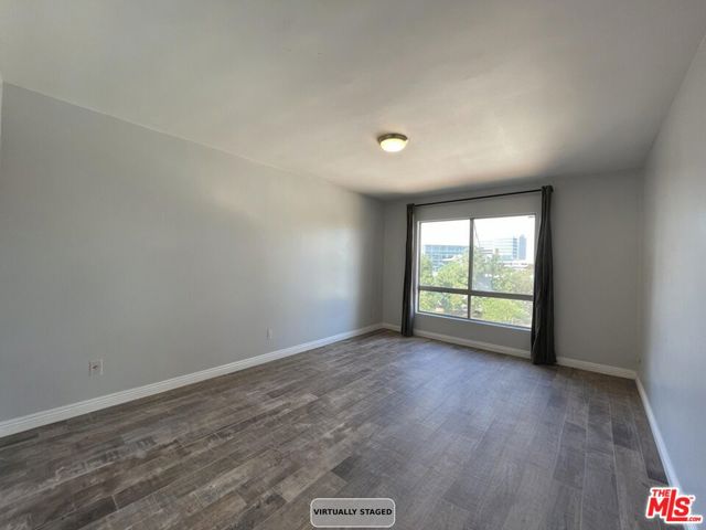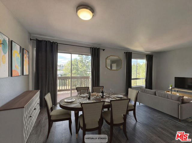 Whether you're relocating to the Culver City area, or looking for a stylish pied-a-terre, this gorgeous top-floor unit in the Adobe Grande complex is the perfect fit! Double-Entry Doors welcome you into a spacious unit, with an open floor plan that connects the living spaces and balcony for a clean light-filled area perfect for both entertaining and everyday living. The galley kitchen has been beautifully remodeled, and features stone countertops and stainless steel appliances. Look out over treetops and city lights, with no neighbors in front to block your view or impose on your privacy. Sliding glass doors lead from the dining area onto a cozy balcony that's suited for enjoying a morning cup of coffee, or catching a spectacular sunset. There is a 2-piece guest bathroom, plus a full-size bathroom down the hall, with a rain showerhead, and a jetted tub to soak away the stresses of the day. The bedroom suite includes a large walk-in closet, and picture windows. Overall, this unit offers an exceptional layout with abundant storage and closet space. The HOA features secure entry, gated parking, elevator, lush landscaping, pool, hot tub, and clubhouse. There is communal laundry room on each floor, with brand-new machines, but there may be an option for in-unit laundry, with permits and HOA approval. Additional conveniences include extra storage space, secured bike room, and one parking space. Adobe Grande is a secure, resort-like complex with a sparkling pool and spa, recreation room, and beautiful grounds featuring running brooks and a koi pond, all just steps from your front door. Situated close to Fox Hills Park and Westfield Culver City Mall, with easy access to freeways and short drives to Venice Beach, Marina del Rey, LAX, and premier restaurants, this location blends convenience with lifestyle. [All furnishings and decor are virtually rendered.]