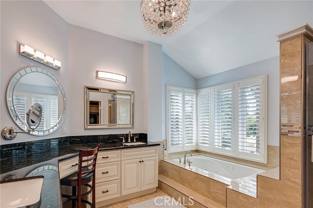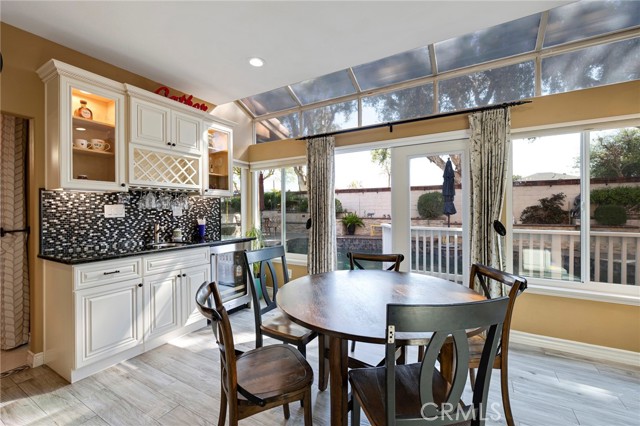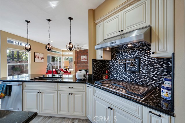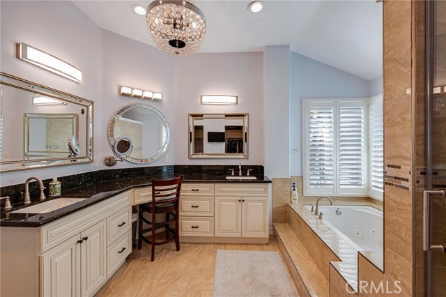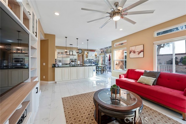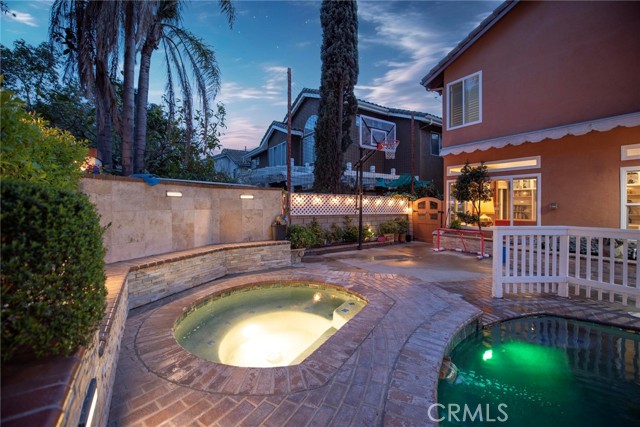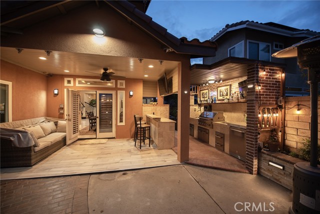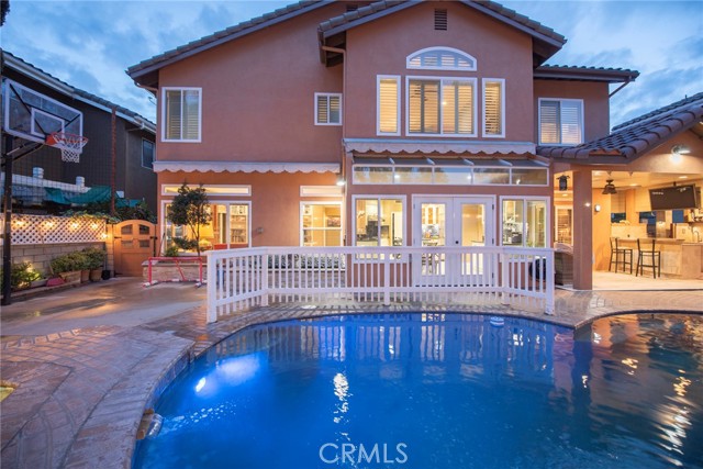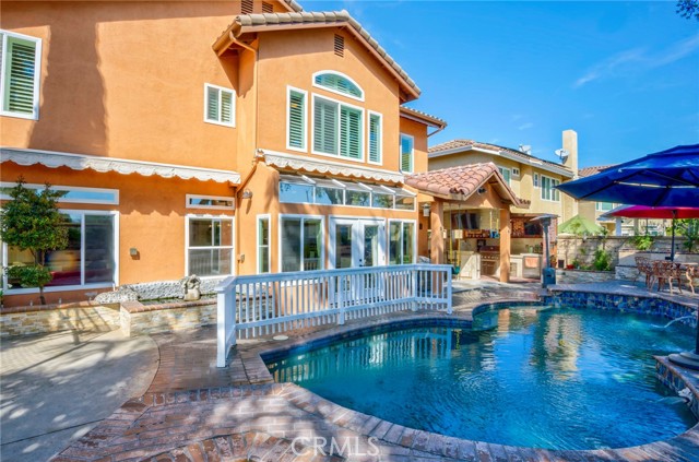 Outdoor upgrades include an outdoor tiled and covered entertainment area with recessed lighting, stool-height bar counter, travertine countertops, stainless steel kitchen and BBQ, wet bar, television, pebble-lined swimming pool with mocaic tile inlays and lion's head water features, outdoor shower with hot and cold water, custom masonry pool decking, surrounds, and coping, custom masonry benches and planters with integrated lighting, koi pond, and a 60-panel rooftop-mounted solar panel array which is owned, not leased.