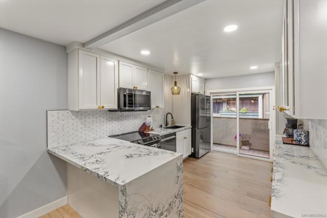 Welcome to Eastbluff La Jolla—an ideally located community just minutes from UCSD, world-class beaches, Scripps Hospital, shopping, dining, and convenient freeway access. This beautifully renovated townhome offers a rare combination of thoughtful upgrades, functional layout, and everyday convenience. Completely remodeled down to the studs in 2023, the home features new electrical and plumbing, engineered-wood flooring throughout, solid-wood interior doors, custom lighting, and Milgard windows and sliders. The spacious living room is anchored by a gas fireplace with custom tile, a new insert, and custom-designed doors, creating a comfortable and inviting space. A separate dining area makes entertaining easy, while the updated kitchen showcases custom cabinetry, quartz countertops, and new appliances, with access to an upper-level balcony—perfect for morning coffee or evening wind-downs. All three bathrooms have been fully redesigned with custom tile, new vanities, and modern fixtures. Additional upgrades include built-in closet organizers, a tankless water heater, a new furnace with a Nest thermostat, an upgraded electrical panel, fresh interior paint, and a Tesla charger. The attached two-car garage offers direct access to the home along with added storage and custom shelving. Outdoor living was enhanced with a regraded front patio and new pavers. Recent improvements have continued to enhance the turnkey appeal, including termite tenting and exterior wood repairs in 2024, as well as a new roof and chimney cap in 2025. Eastbluff La Jolla features two community pools, a clubhouse, and proximity to Villa La Jolla Park. This is a move-in-ready opportunity for buyers seeking a well-updated home in one of La Jolla’s most convenient and desirable neighborhoods.