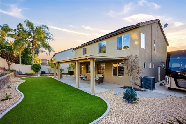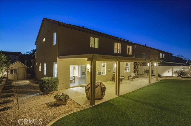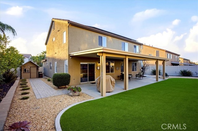 Opportunity awaits the buyer seeking a truly magnificent property and entertainers paradise all wrapped into one! The open and very spacious floor plan offers 5 bedrooms and 3 full baths for the growing family. Your lower level features a stunning chef's kitchen w/ beautiful granite counters, stone tile backsplash, and huge raised breakfast/entertainment bar. In addition, you'll find an oversize guest quarters with a full bath around the corner giving it that "en-suite" feel. The massive family room w/ fireplace offers more than enough space for gatherings and the spacious dining area is perfect for family dinners. The family and dining areas are filled w/ plenty of natural light from the over size windows. The 2nd floor offers a huge master suite w/ a generous master bath that includes dual vanities, soaking tub, and shower. The dual walk-in closets are a plus! The upper level also has 3 additional over size bedrooms and a full bath. Your beautiful outdoor entertainment area features an awesome aluma-wood patio cover with overhead and accent lighting. In addition, you'll find a large artificial turf area, terraced block retaining walls, a lovely storage shed, and landscape lighting throughout.