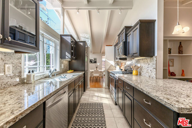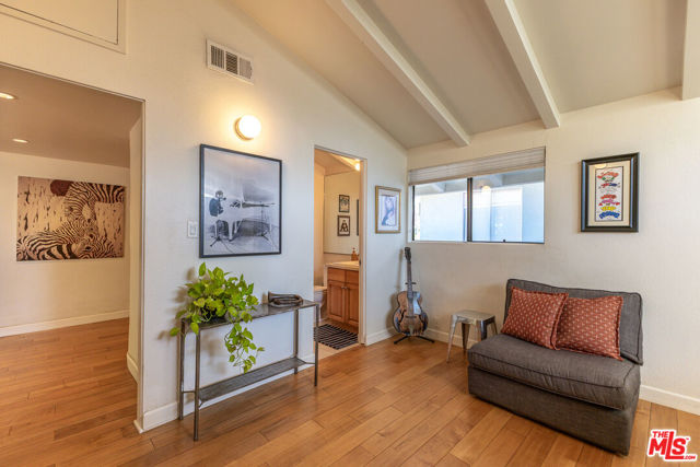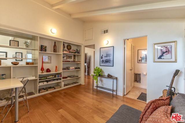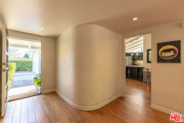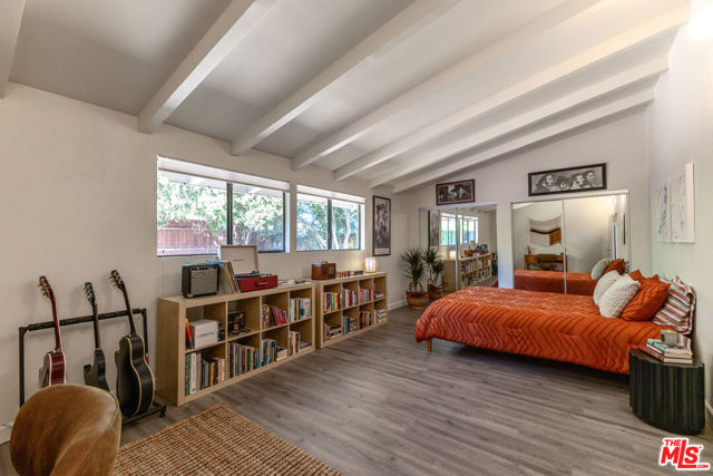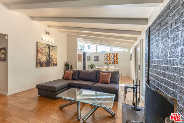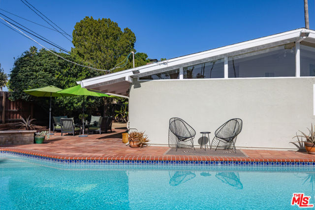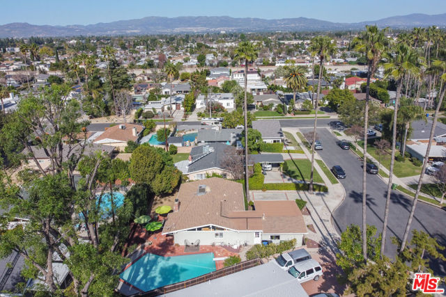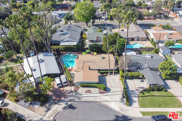 Located on a quiet cul-de-sac in the highly coveted Corbin Palms neighborhood, this exceptional Mid-Century Modern pool home was designed by renowned architects Dan Palmer & William Krisel, AIA, This architectural gem showcases classic MCM elements including dramatic clean lines, low-profile roofline, vaulted ceilings, clerestory windows, and an expansive wall of glass that flood the interiors with natural light while maintaining privacy and a seamless indoor-outdoor connection. The bright, open-concept living and dining areas feature vaulted beamed ceilings, maple flooring, wood-burning fireplace and oversized picture windows, creating a warm and inviting atmosphere throughout. Overhead clerestory windows provide abundant ambient light and enhance the home's airy feel. The kitchen is thoughtfully designed with granite countertops, stainless steel appliances, abundant cabinetry, and a convenient pull-out pantry. Just off the kitchen, an open den with custom built-in bookcases sits near the guest bath, creating a functional and inviting flex space. The primary suite offers an en-suite bath, a wall of closets, newer flooring, and clerestory windows for soft natural light. A spacious second bedroom overlooks the lush backyard and includes generous closet space and newer flooring. The fully fenced backyard is a true retreat, perfect for entertaining and embracing Southern California indoor-outdoor living. Enjoy a stunning pool, lounge area, and mature trees with drought tolerant landscaping that provide exceptional privacy. Additional features include a separate laundry room with access to both the garage and backyard, plus a small office located just off the garage ideal for working from home. Further highlights include central air and heat, copper plumbing, updated light fixtures, recessed lighting and timeless Mid-Century character throughout. Assessor showing 4BR + 2BA. Home is currently 2BR + 2BA. Ideally situated near the Haynes Street Greenway, with easy access to restaurants, shopping, bike paths, Westfield Topanga Village, Warner Center, and public transportation.