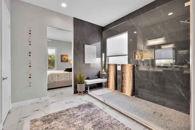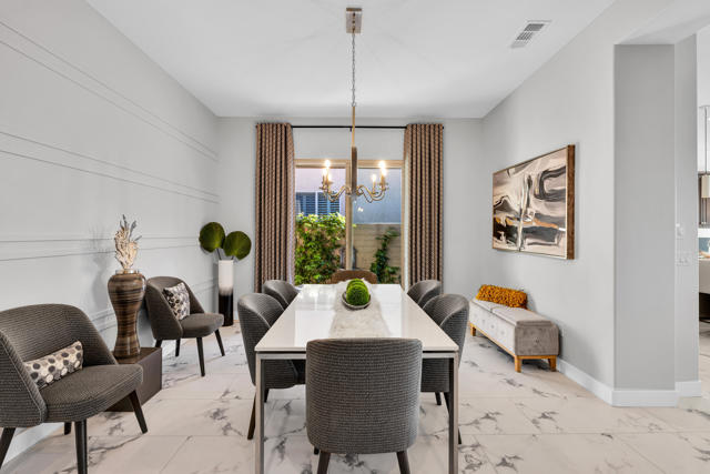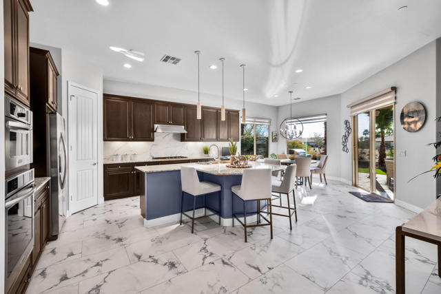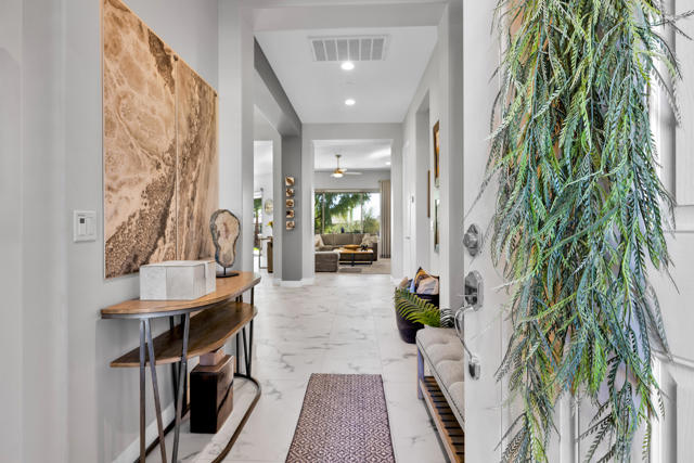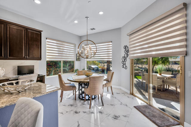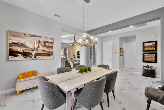 Gorgeous new listing Sun City Shadow Hills 3rd phase. Pavered driveway & walkway leads to beautifully upgraded & meticulously maintained 3 bedroom 3 bath open floor plan The Gathering model situated on the 2nd hole of the North Course w/expansive golf & mountain views. South facing home features high ceilings, 18''x36'' LVT (luxury vinyl tile) flooring throughout except for newer carpet in the guest bedrooms & main closet, new baseboards, custom interior & exterior paint, upgraded lighting, plumbing & electrical, custom imported light fixtures, motorized blinds, shutters & drapes. Great room, kitchen, breakfast area and main bedroom all w/views of the golf course.Kitchen has beautiful cabinetry w/pull out shelves & built in drawer for trash., custom back splash,granite counter tops, a large center island that seats four comfortably, pendant lights & under counter lighting. There is an adjoining breakfast area plus a formal dining room with a custom wall enhancement & a view of an outside patio seating area with a fountain. Main bedroom suite with newly redone bathroom. 43''x120'' large walk in shower w/ marble like tile & clear shower glass wall, double sinks w/quartz countertops, new fixtures & adjoining walk in closet with built-ins.Separate private guest wing with two bedrooms and two bathrooms. Laundry room has sink & cabinets. Oversized garage w/epoxy floor, extra lighting, motion detector light, exhaust fan & overhead racks. A large pavered & epoxyed patio w/alumawood cover & fountain to enjoy the beautiful, serene golf course views. Upgraded landscape, irrigation & turf grass Sun City Shadow Hills is a vibrant, active adult community w/clubhouses, pools, spas, golf, tennis, pickle ball, & bocce courts, tons of clubs activities & entertainment.This home is a ''must see''. Shows like a model. Sellers have done beautiful upgrades and maintained it like new..