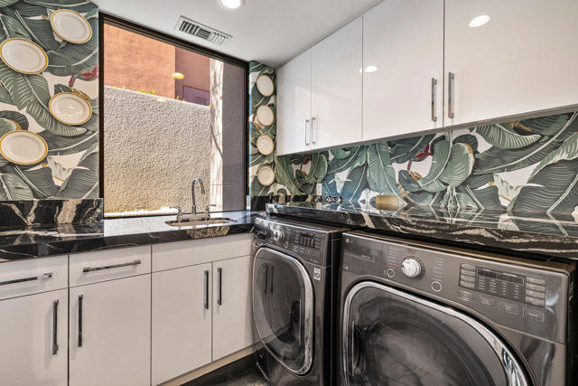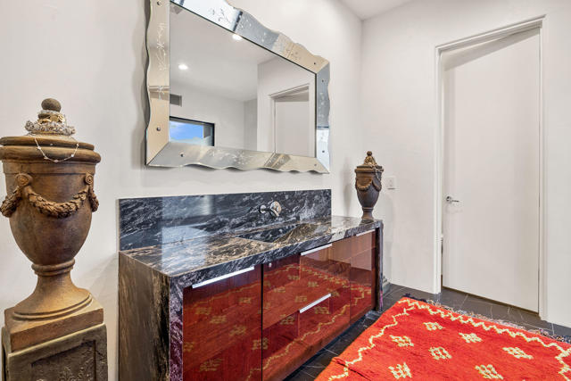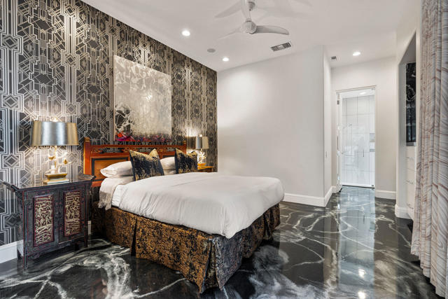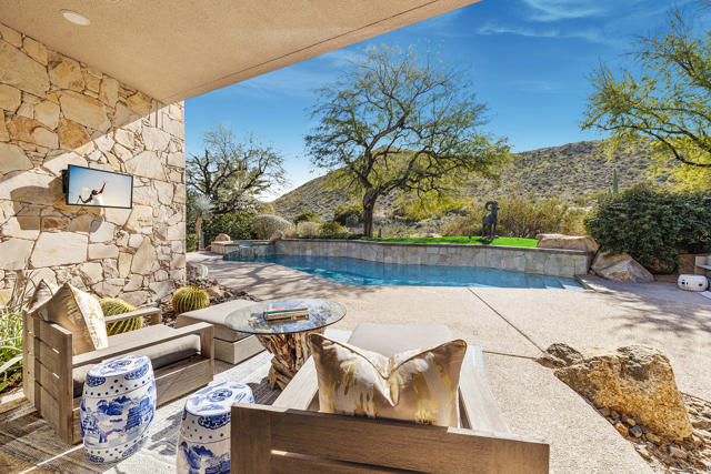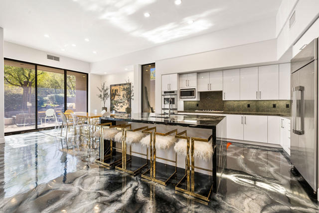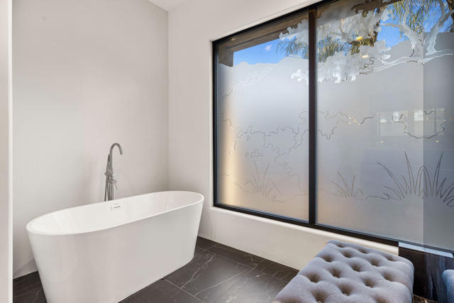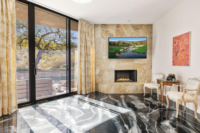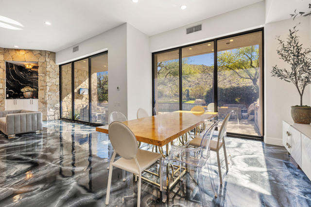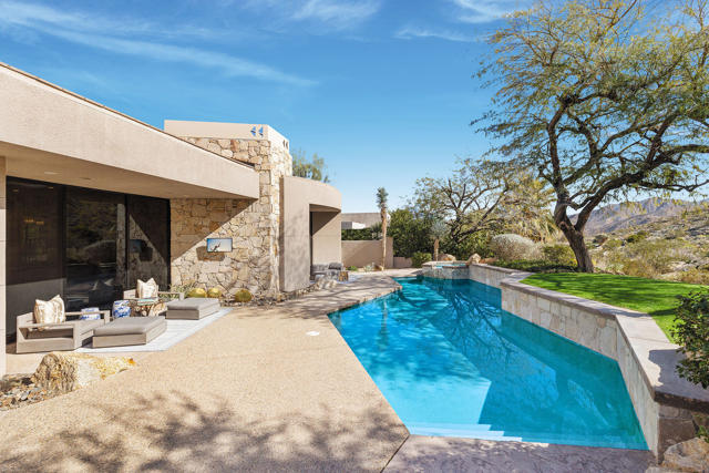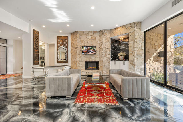 Welcome to your private desert escape, entered through custom gates with opaque privacy glass into a serene entry courtyard serving both the main residence and detached guesthouse. Low-maintenance desert landscaping enhances the sense of retreat. The great room is filled with natural light, featuring high ceilings, walls of glass, minimalist design, and cutting edge designer epoxy flooring throughout. A fireplace, television, wet bar, and direct access to the outdoor entertainment patio create effortless indoor-outdoor living. The space flows seamlessly into the kitchen and dining areas, ideal for entertaining, with sunny southern mountain views. The dining room is wrapped in floor-to-ceiling glass, offering picturesque views of the pool, spa, outdoor living areas, and mountains beyond, with convenient access to both the kitchen and outdoor barbecue area. Centrally located, the open kitchen keeps everyone connected and features a large quartz slab preparation island with double sink and breakfast bar seating, granite countertops, cabinet-faced refrigerator, professional gas range, double ovens, microwave, and dishwasher. The tranquil primary suite is generously sized and includes a stone fireplace, television, and sliding glass doors opening to the pool, spa, and outdoor living areas. A private patio offers mountain views just outside the bedroom. The spa-inspired bath features a custom vanity, freestanding tub, large porcelain tile shower, private lavatory, walk-in closet, and etched privacy glass. An interior guest suite includes a full bath, closet, television, and direct access to the entry courtyard. The detached guesthouse is fully self-contained with a television, morning bar, microwave, refrigerator, walk-in closet, and bath filled with natural light and a private lavatory. Outdoor living offers a relaxing retreat with covered seating, television, pool and spa views, built-in barbecue, turf, and desert landscaping. Additional features include a 2-car garage plus golf cart garage with epoxy flooring, and desirable south exposure providing full sun on the pool and patio.