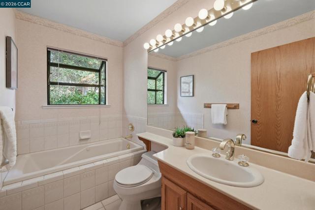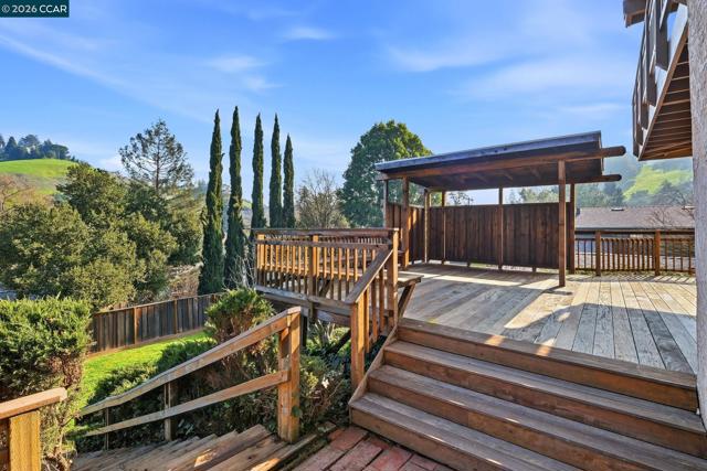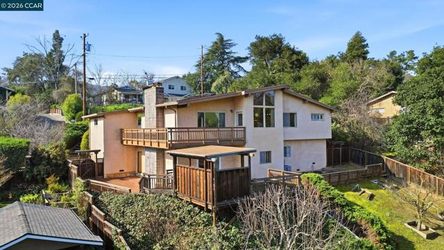 A true gem in a sought-after neighborhood, this custom & unique home captures neighboring hillside views. The main living spaces feature stunning vaulted, beamed ceilings w/windows that extend to the ceiling, creating an open & airy feel. The roomy eat-in kitchen offers ample cabinetry & counter space, spacious breakfast bar, & large picture windows showcasing the views, direct access to the newly replaced wrap-around balcony—perfect for indoor-outdoor living. A nicely sized dining room w/ceiling fan is ideal for gatherings. The spacious living room boasts a charming fireplace with a raised hearth that doubles as additional seating. The entryway features hardwood flooring, adding warmth & character. Upstairs bedrooms are generously sized & offer hardwood flooring, shutters, ceiling lights, and large windows. Downstairs you’ll find a large versatile room complete with a brick fireplace, wet bar, & bathroom, ideal as a family room, game room, work-from-home, or guest retreat. A sliding door provides direct access to the backyard & deck. Set on nearly a ¼-acre lot, the outdoor space offers endless possibilities, including a partially covered deck w/built-in benches, a large level area, fruit trees, blackberry bushes, multiple spaces to relax & enjoy peaceful setting & scenic views