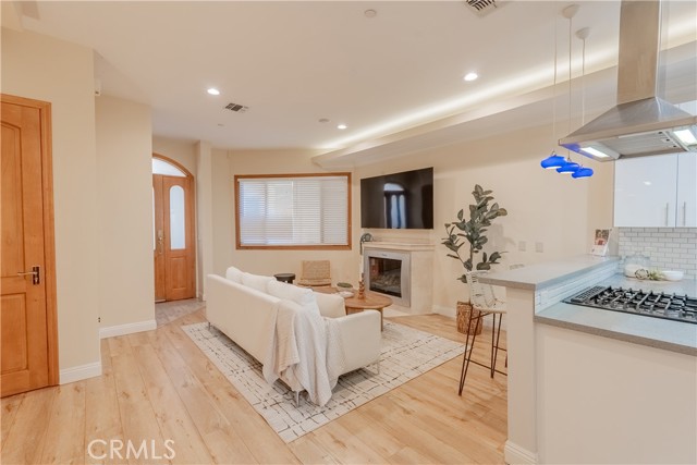 Step into the inviting living room, where soaring ceilings and recessed lighting bathe the space in a soft, natural glow. A cozy fireplace anchors the room, while a charming decorative wall niche adds architectural character and the perfect place to display art or keepsakes.