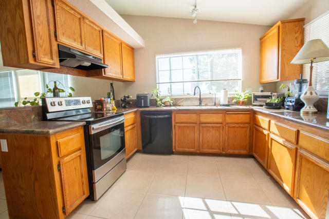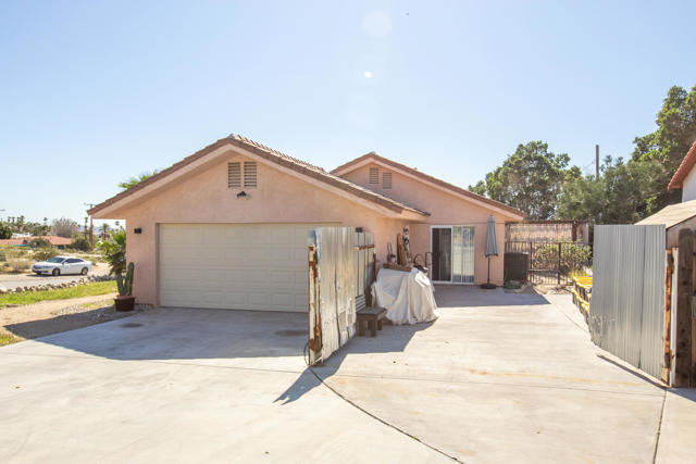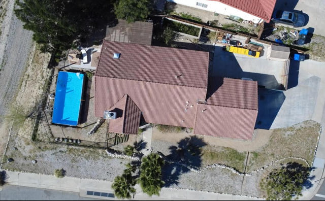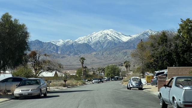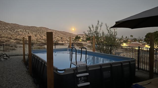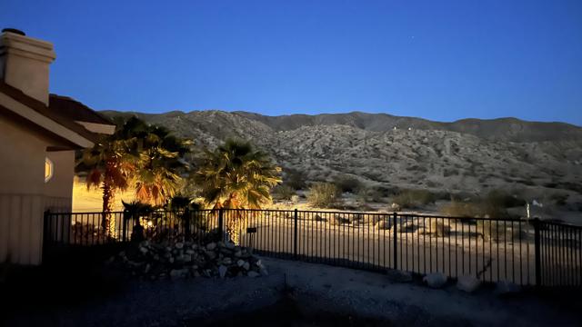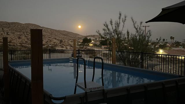 Welcome to this very remarkable 3-bedroom, 2-bath hilltop retreat offering panoramic views for miles and miles....truly a rare opportunity to own a home that sits above the valley with breathtaking west-facing mountain scenery from nearly every window!Perched on an elevated corner lot, this exquisite residence provides enhanced privacy and spectacular backyard views, complete with a saltwater above-ground pool...perfect for relaxing or entertaining on warm desert days. Photos truly tell the story, but experiencing these views in person is unforgettable.Inside, you'll find tile flooring, a bright kitchen featuring granite countertops, warm wood cabinetry, stainless steel refrigerator, skylight, and large windows that flood the space with natural light. The spacious primary suite offers a modern bath with veined quartz shower, frameless glass enclosure, and walk-in closet for added comfort and convenience.Additional highlights include a 2-car garage, ample gated RV-sized parking, plus a storage shed -- practical features that are always a big plus. And best of all... NO HOA!Step just a few feet across the street to trailheads, dog-walking areas, and the beautiful Swiss/Bryce's Canyon Trail...ideal for hiking, biking, and enjoying scenic desert and mountain views.Why pay Palm Springs prices when you can spend so much less and still be just a short drive away? Properties this special....with privacy, views above the valley, outdoor recreation at your doorstep, and room for all your toys...are almost impossible to find.Come see it for yourself... this serene desert escape is ready to impress!!