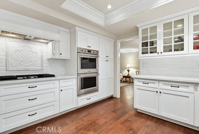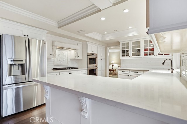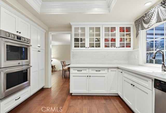 The updated kitchen is designed with both functionality and style in mind, featuring shaker-style cabinetry, quartz countertops, subway tile backsplash, and a custom mosaic accent backsplash behind the cooktop. Additional upgrades include rollout cabinet drawers and dual Lazy Susan storage, maximizing organization and usability.