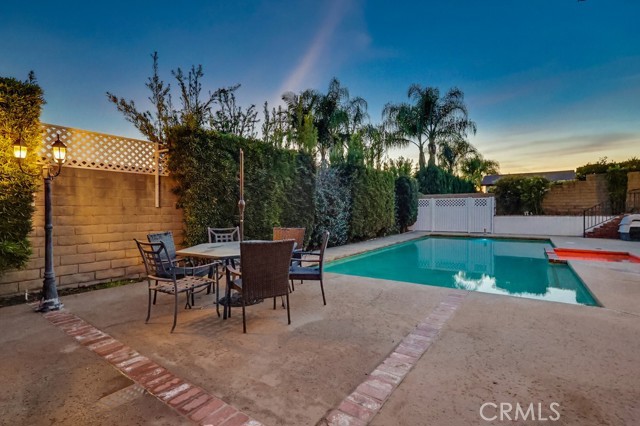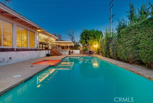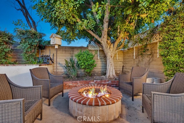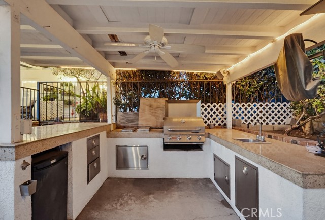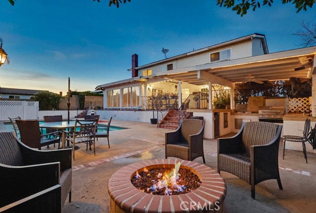 The backyard is ideal for entertaining with a private sunken pool area, fire pit, and a fully equipped outdoor kitchen featuring a barbecue, sink, refrigerator, ceiling fan, TV, and ambient string lighting, perfect for enjoying Southern California living year-round.