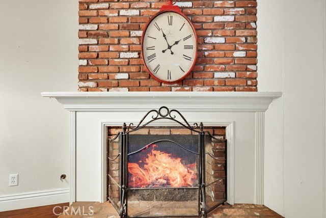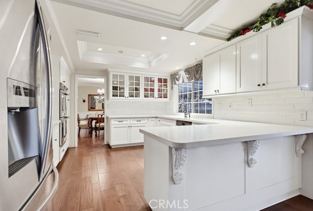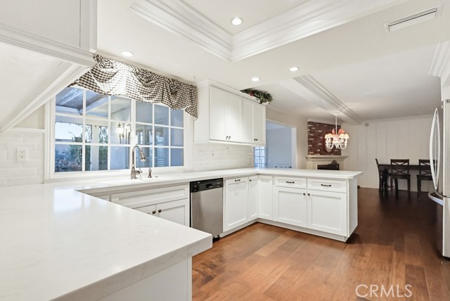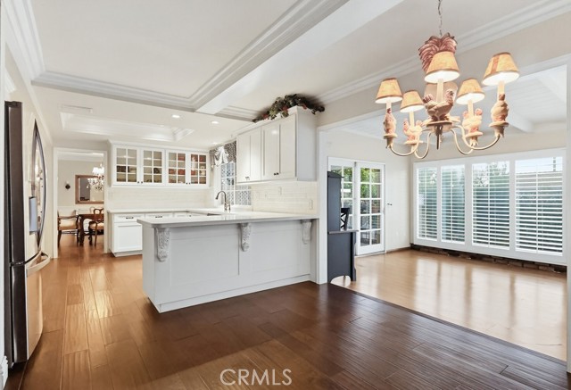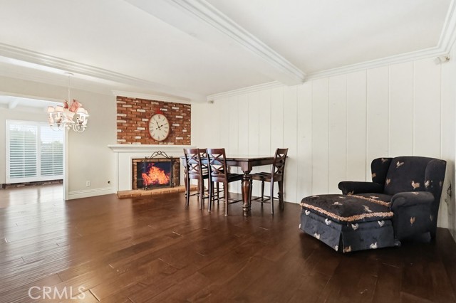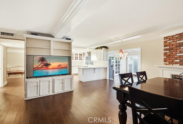 The living room and kitchen showcase coffered ceilings with recessed lighting along with a cozy gas fireplace featuring a brick hearth and wood mantle, creating an inviting central gathering space. Beautiful wood flooring flows throughout the kitchen, dining, and family room areas, enhancing warmth and continuity throughout the main level.