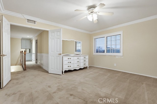 Upstairs, all bedrooms are generously sized and include ceiling fans, while the primary suite offers dual closets and crown molding, creating a comfortable retreat. The upstairs hallway bathroom has been updated with a shaker-style vanity, granite countertops, and tile flooring. Bathrooms and select living areas also feature tasteful wainscoting accents that enhance the home’s overall charm.