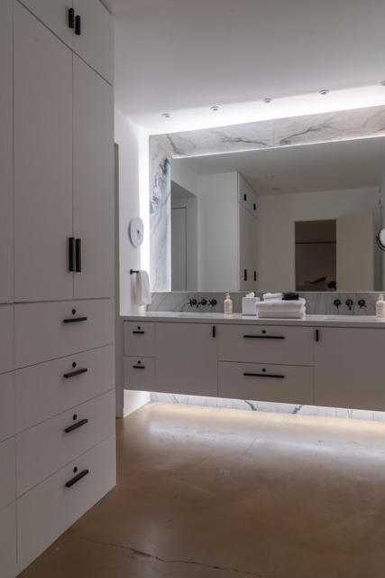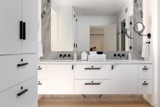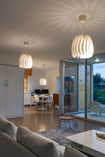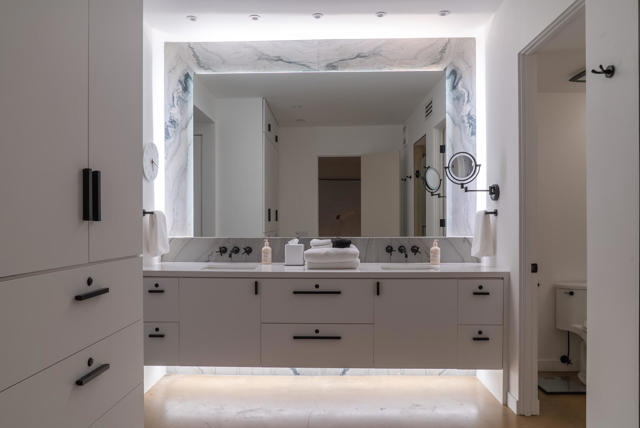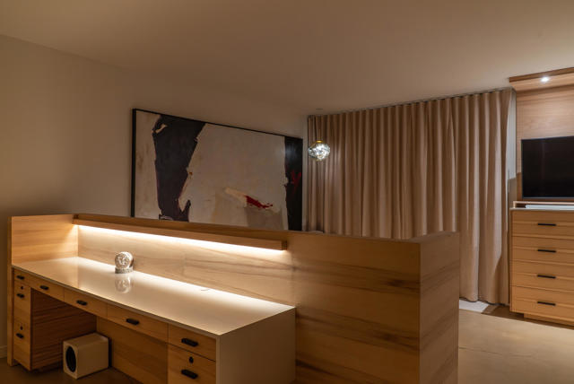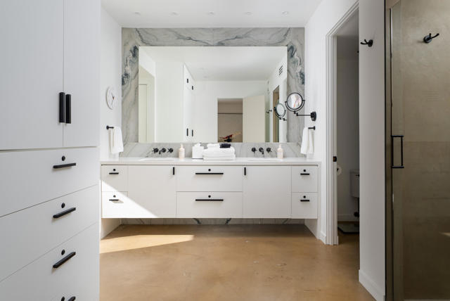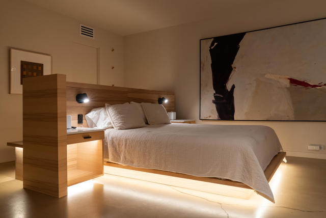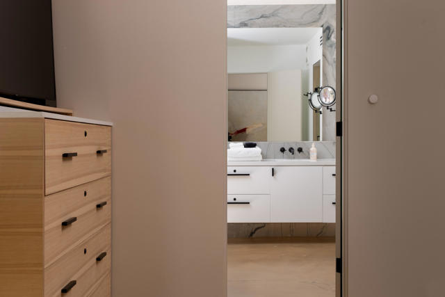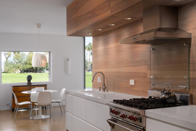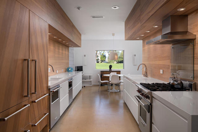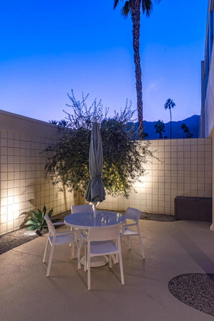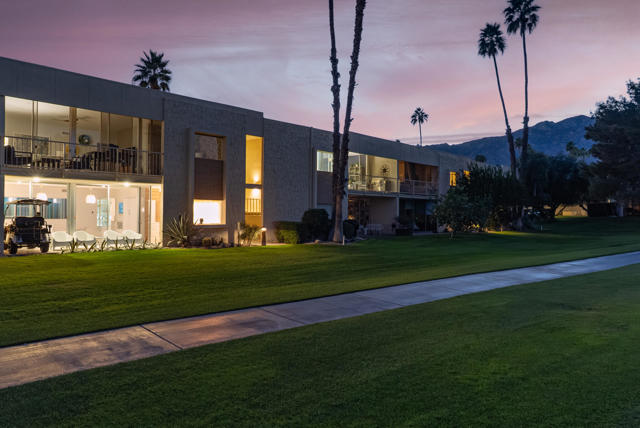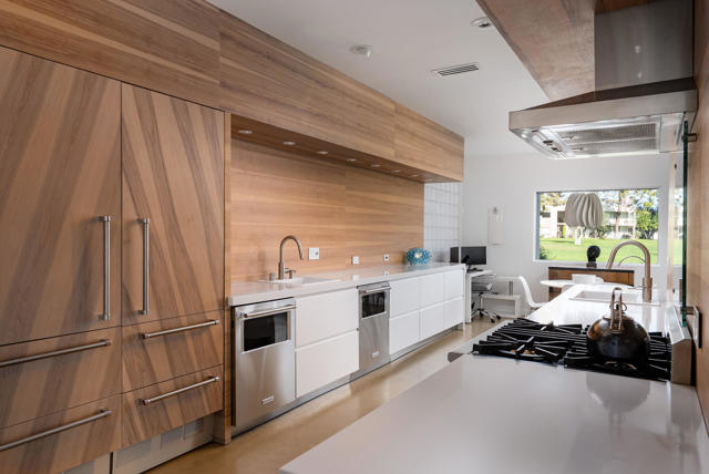One of the most unique homes at Seven Lakes Country Club, this gorgeous 1 bedroom + 2 bathroom home was discerningly restored and renovated incorporating 21st century state-of-the-art tech into this late-century modern property. By day, enjoy Palm Springs' mountain views across the golf course and the iconic 13th green where in 1968 President Eisenhower sunk his only hole-in-one. The state-of-the-art chef's kitchen is clad with Swedish Chicory installed by a master European craftsman, Absoluto Bianca quartz waterfall countertops, illuminated cabinet drawers, a pair of 27'' Sub-Zero French door refrigerators with pinnacle wood fronts complete with four French freezer drawers, stainless Wolf dual-fuel range, KitchenAid dishwashers, integrated wine cooler, ultra-steam oven, water filtration system, espresso machine, and undercounter inductive phone charging. A beautifully reimagined and expanded Primary Bath offers direct access to the private enclosed courtyard. Ten-foot floor-to-ceiling sliders. Out your door, the largest of 7 Lakes' 15 tranquil pools is just steps away. Past the 24-hour guarded gate, 'The Gem of the Desert' offers a unique elevated lifestyle with its Ted Robinson-designed 18-hole executive golf course and the lively William Cody designed clubhouse waiting to welcome you to its formal dining room, casual cocktail lounge, and a terrace overlooking the waterfall-fountain. Welcome home!