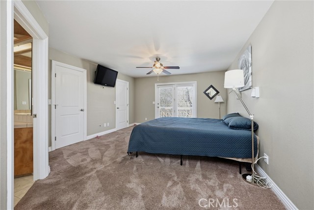 Primary bedroom with two walk-in closets and an en-suite bathroom, complete with both a tub and shower. French doors open to a deck where you can soak in the stunning lake views.