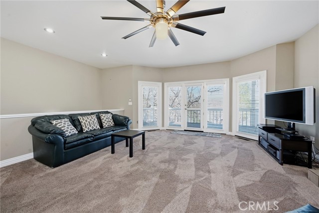 Living room features French doors and extra windows, providing ample natural light and access to a covered porch, perfect for entertaining or simply enjoying the serene surroundings.