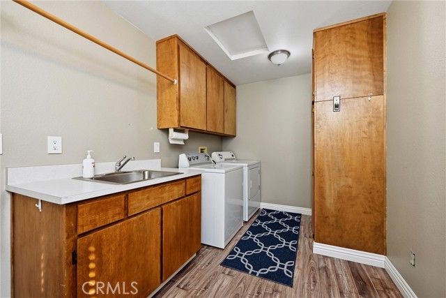 Oversized laundry room equipped with cabinets, a sink, and washer/dryer, located right off the garage for added convenience.