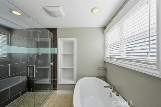 Spacious primary bedroom featuring a walk-in closet and a brand new, luxurious bathroom. Enjoy the all-tile design, double vanity, oversized walk-in shower with multiple shower heads, and a sunken tub for ultimate relaxation.