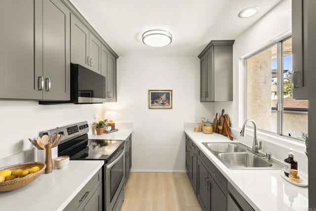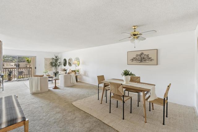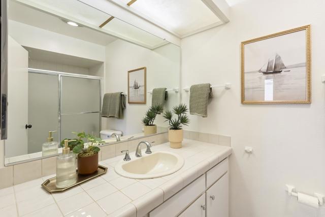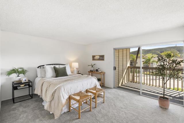 Approximately 1,200 square feet of well-designed living space awaits in this two-bedroom, two-bathroom condominium. The spacious layout features an open-concept design that seamlessly integrates the living and dining areas, allowing natural light to flow throughout. The primary bedroom boasts an en-suite bathroom, while the secondary bedroom also has its own private bath. Enjoy the convenience of in-unit laundry and a detached garage with a large storage room. The living space is brightened by the home's generous windows, including two large sliding glass doors that provide access to the spacious balcony. The balcony offers scenic views, creating an ideal setting for relaxation or al fresco dining. The kitchen has been updated with new cabinets and countertops, complementing the new flooring. The covered entryway and vibrant neighborhood setting add to the appeal of this condominium, which is conveniently located in close proximity to the nearby lake. The combination of a spacious layout, thoughtful updates, and desirable amenities make this home an ideal choice for those seeking a comfortable and functional living space. The location within Lake San Marcos offers access to shared amenities and common areas, including pool, fishing, golf, boating and kayaking, etc. Be sure to watch the virtual tour