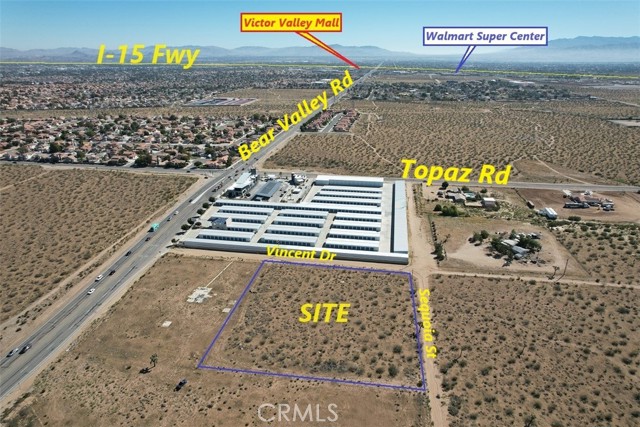 Excellent location, 2.49 acres of Level commercial parcel at the corner of Vincent Dr. and Sequoia St, just 200 ft +/- from Bear Valley Rd, water and electricity on the street. A few permitted uses per city of Victorville are Storage containers, parking lot sale, Restaurant, small recycling facility, Vehicle Storage, etc. The configuration of the site allows for easy access and visible from Bear Valley Rd. Lot located just one mile from US- 395 Hwy to the west of the property and only 2 miles from I-15 Fwy (Exit 147) to the east of the property, (C-1) Commercial Zoned, and next to a self-storage close to a major thorough fare Bear Valley Rd, (Seller may carry with 50% down, 8% interest rate, up to 5 years amortized monthly payments.) Google Maps coordinates for location of the property are: 34.469000, -117.384639,
